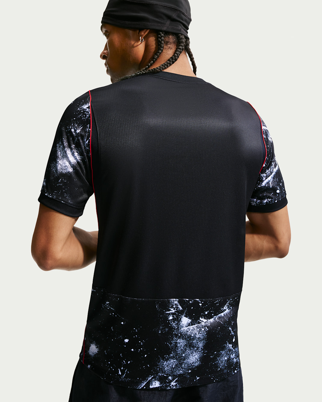 Built for performance, the shirt incorporates Nike’s Aero-FIT system, developed at yarn and stitch level to enhance airflow and regulate body temperature. The fabric combines open and closed knit zones to help move air across the body while maintaining a lightweight feel. All graphic elements are engineered directly into the material to support breathability and durability.