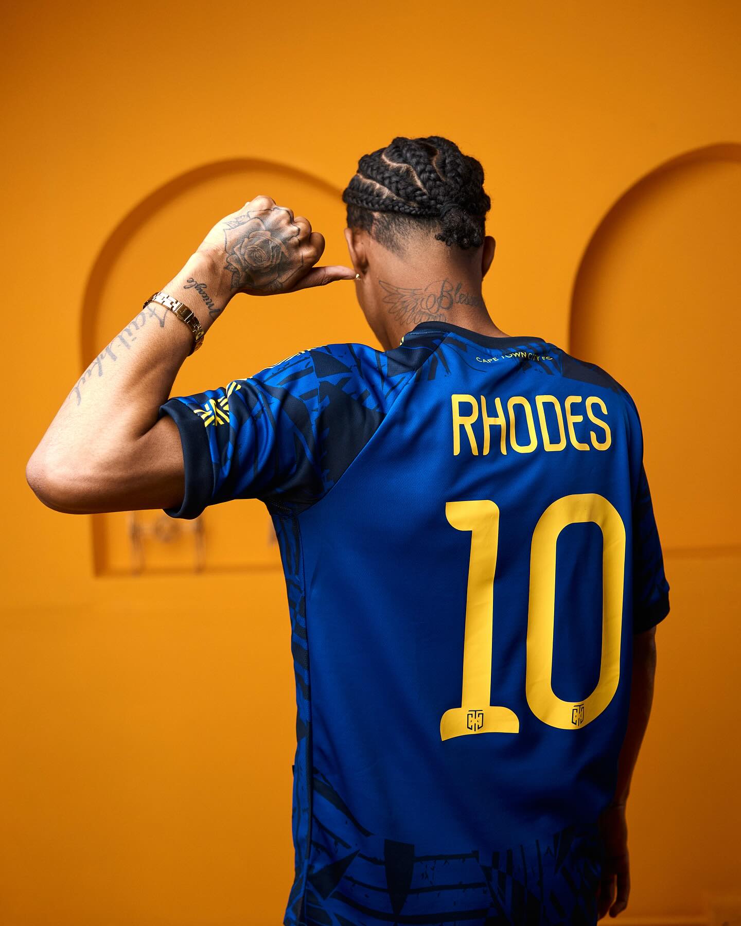 The club crest sits on the left chest with the Umbro logo opposite. On the back, just below the collar, “Cape Town City FC” is featured in yellow. Player names and numbers also appear in yellow, with the club’s initials CTC incorporated into the base of the numbers.