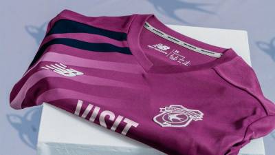 New for the current season, the burgundy/claret/garnet release features navy-blue embellishment to the right shoulder, a lightening of the tone in striping below, and detailing - including the crest - in white.