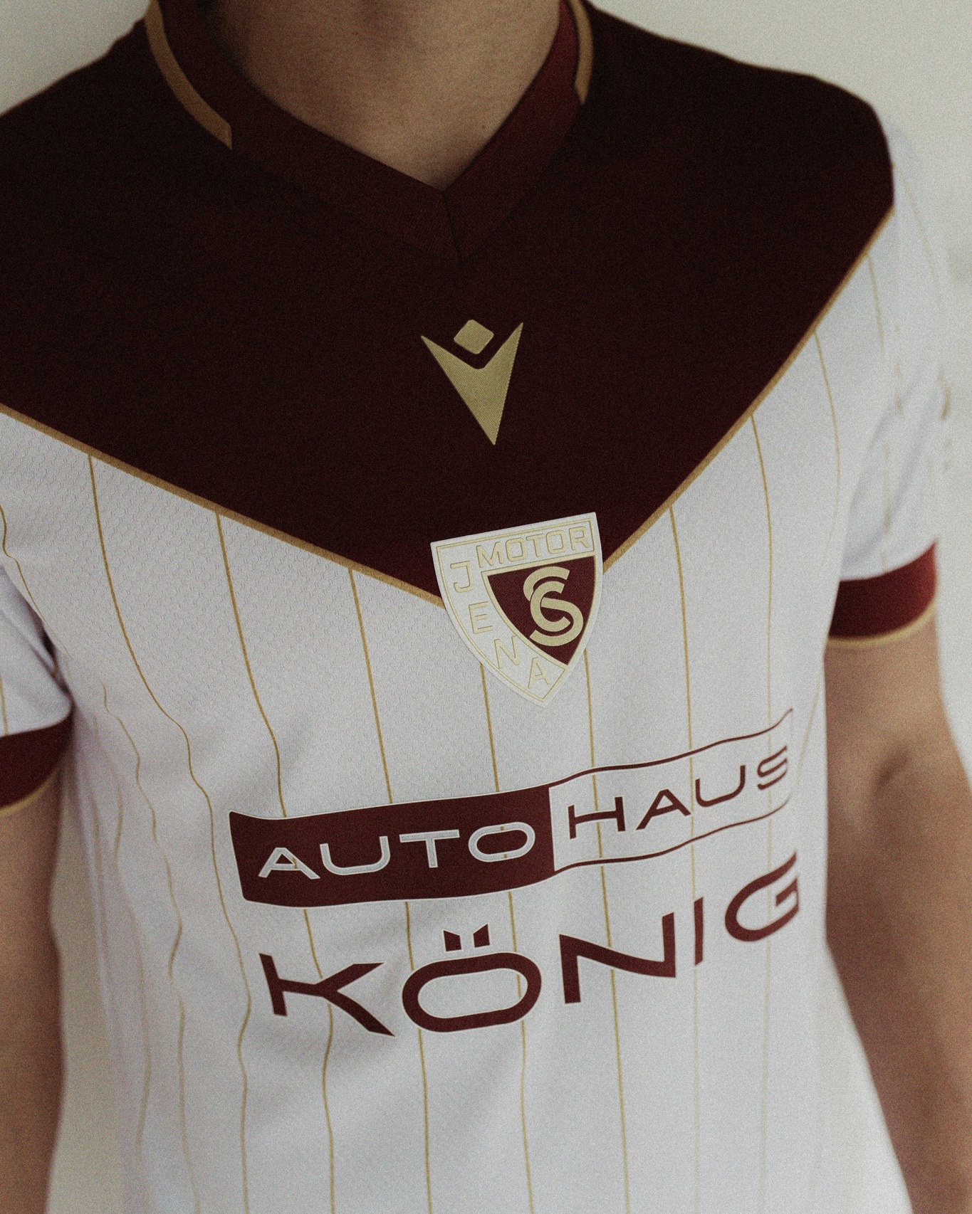 The Carl Zeiss Jena football shirt features a white base combined with burgundy and gold detailing, referencing visual elements linked to the SC Motor Jena era. The front features fine vertical pinstripes and a large burgundy section across the chest, along with a central club badge redesigned to reflect the historic SC Motor Jena crest. The Macron logo appears above it in gold.
