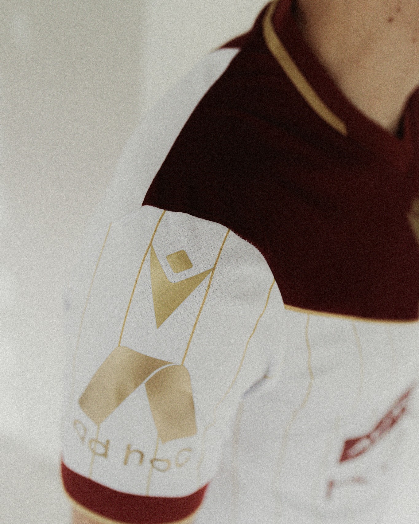 The shorts and socks follow the same colour direction, with white as the primary tone and supporting burgundy accents. Player name and numbering appear in burgundy on the back.