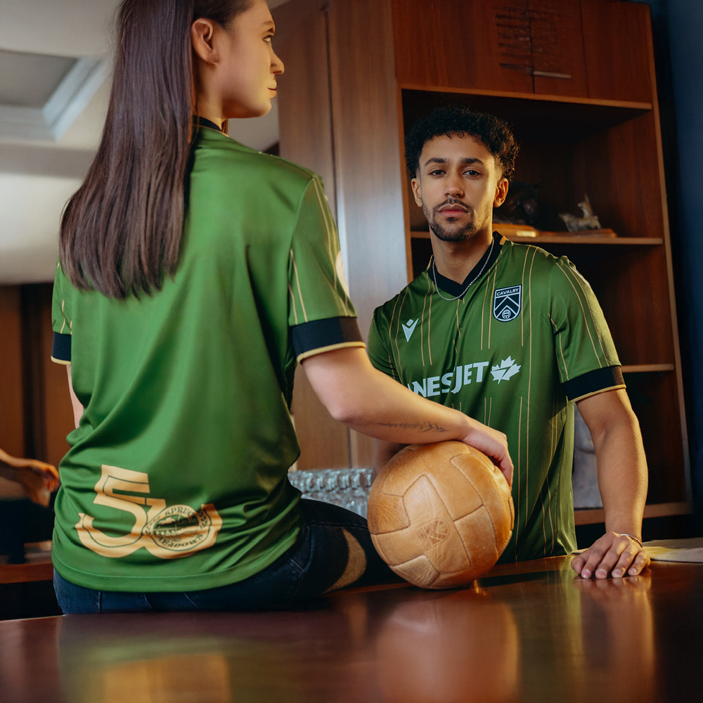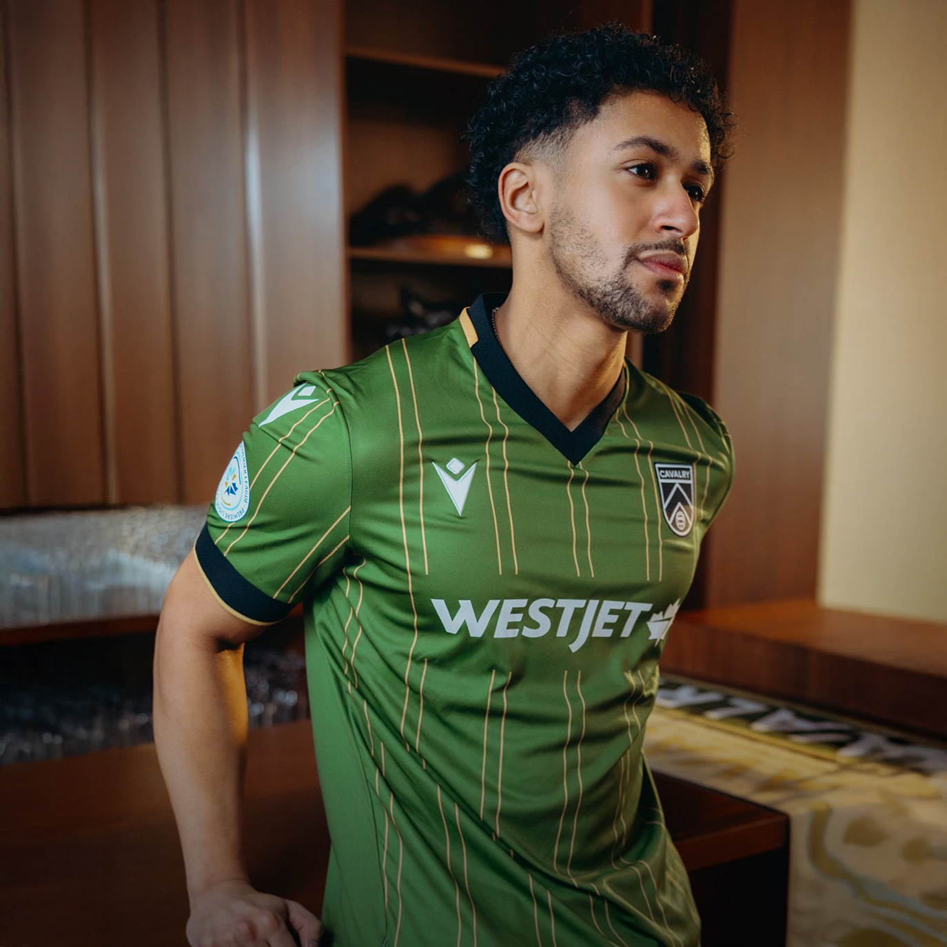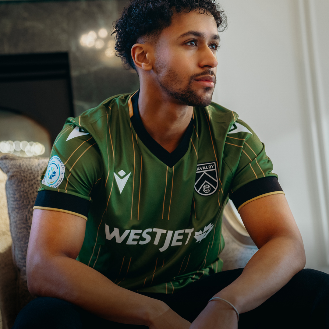 The 2025 jersey by Macron features Cavalry’s alternate green base with seven thin gold pinstripes, symbolising each year of the club’s journey since its founding. Gold detailing also trims the cuffs and collar. The club badge appears in monochrome on the chest, while the back of the shirt displays a commemorative Spruce Meadows 50th Anniversary emblem.