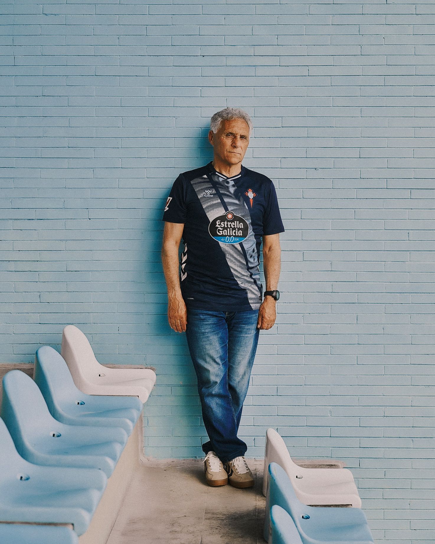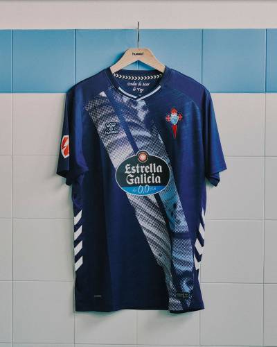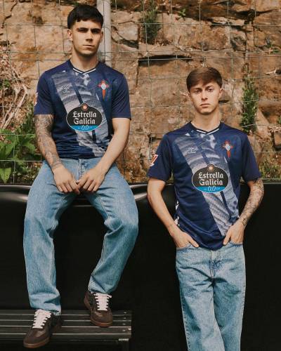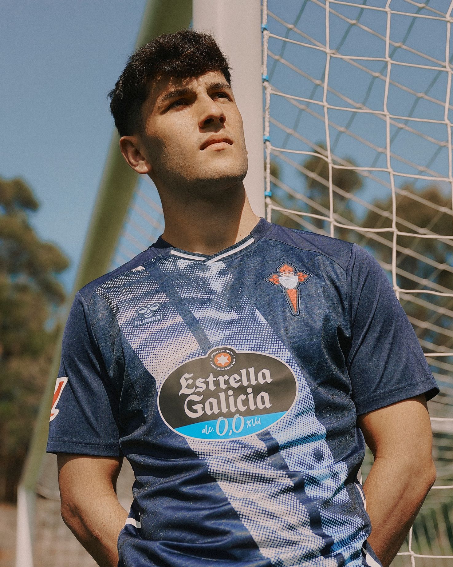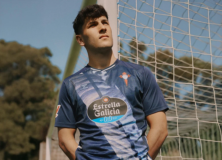 The club crest is embroidered on the chest, and the phrase “Ondas do Mar de Vigo” (“Waves of the Sea of Vigo”) by Galician troubadour Martín Códax is placed inside the collar. A trisquel symbol sits on the back of the neck.