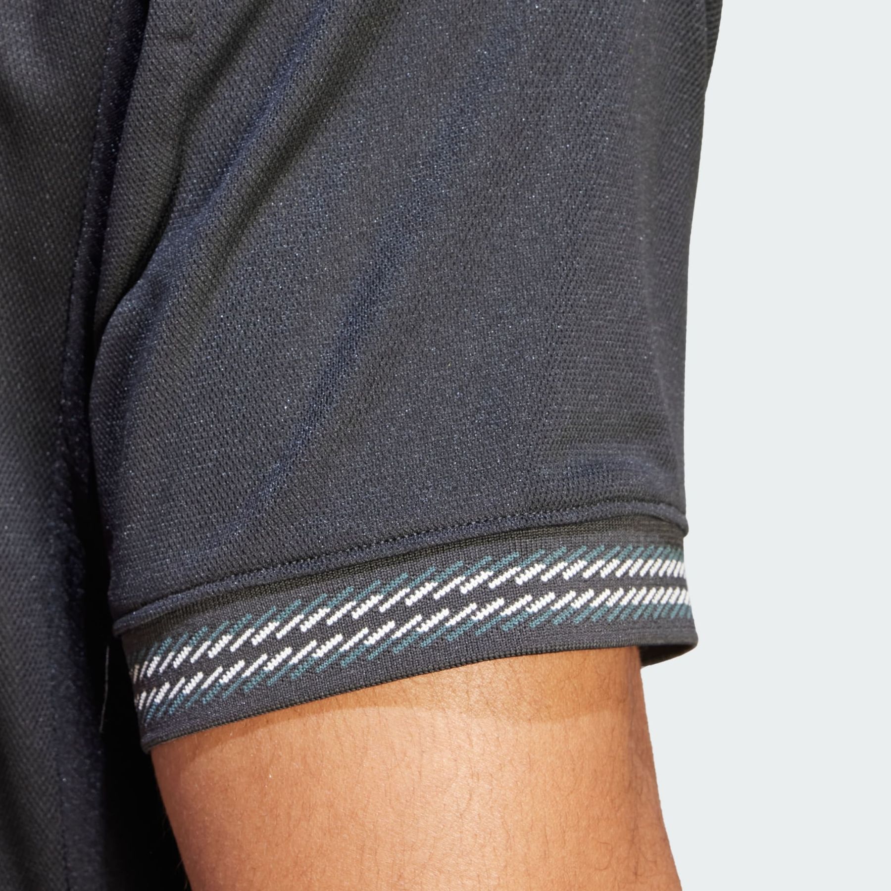 The black adidas shirt features intricate details on the ribbed crewneck collar and cuffs, blending history and modernity.