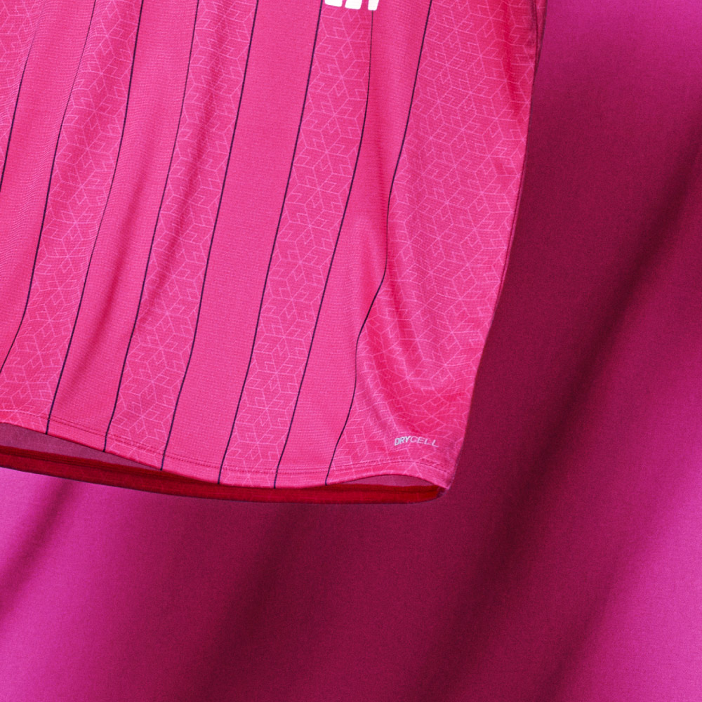 The new pink first-choice release from Puma combines blue pinstripes with alternating plain and stylised-cherry-blossom stripes.