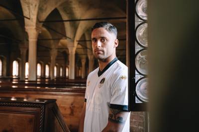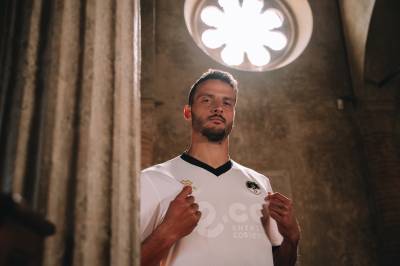 The kit features a white jersey with black and gold detailing, drawing from the aesthetic of Cesena’s early years and is paired with black shorts and white socks. A commemorative patch near the hem of the shirt shows each shirt’s serial number out of 720. On the upper back, “1940–2025” is embroidered to acknowledge the anniversary.