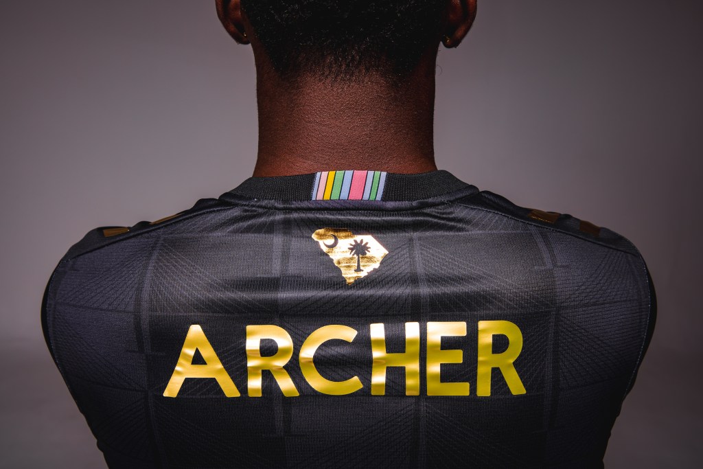 The neckline includes a gold foil silhouette of South Carolina with the palmetto tree and crescent moon from the state flag, along with a nod to Rainbow Row. The kit is completed with black shorts and socks.