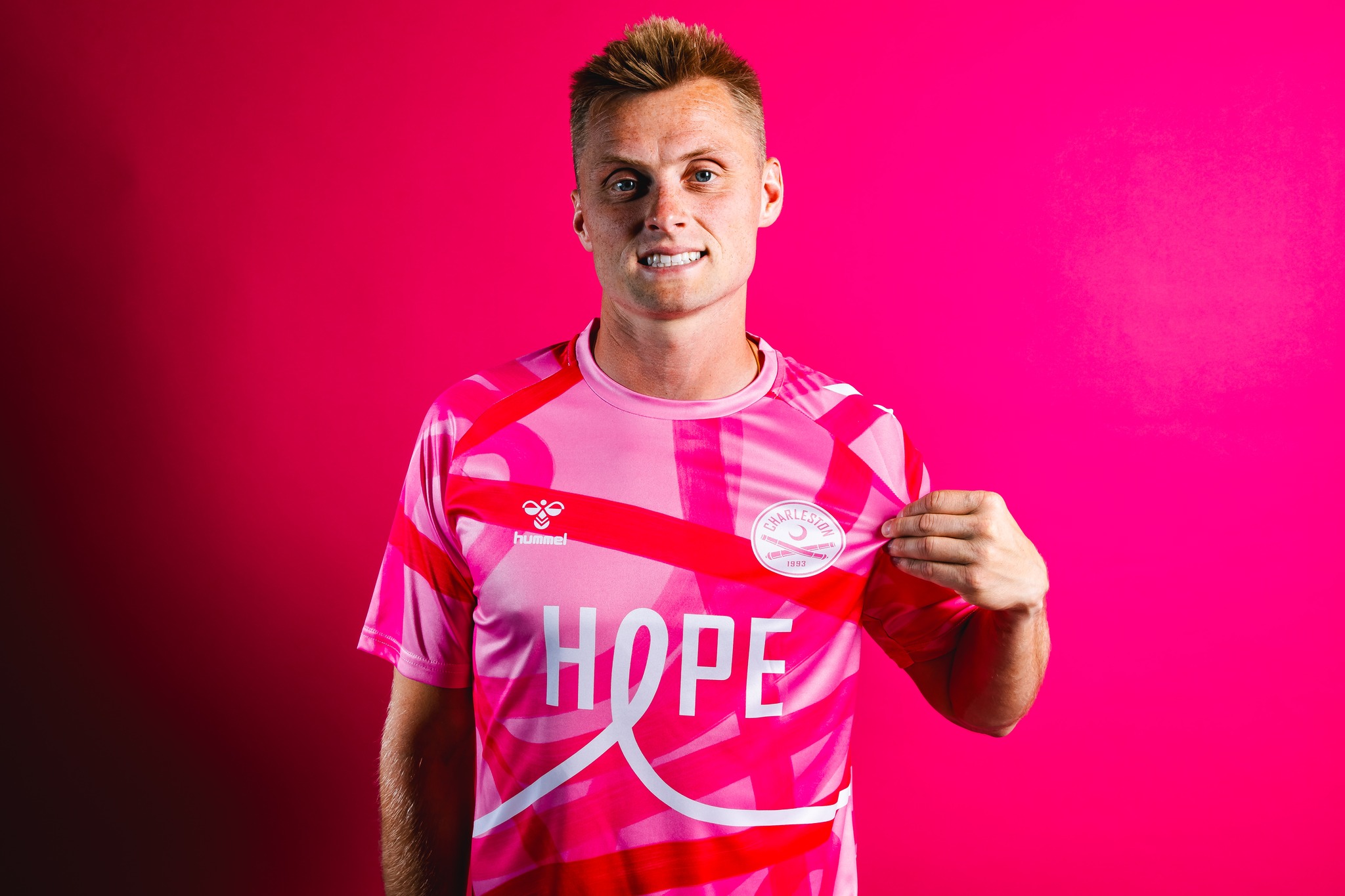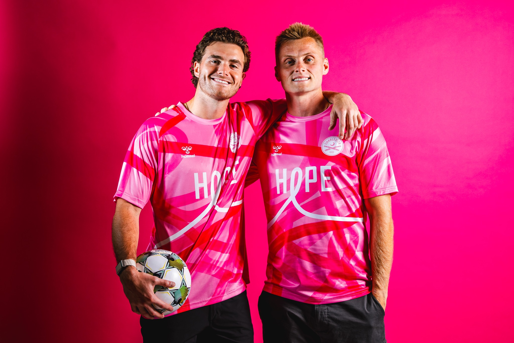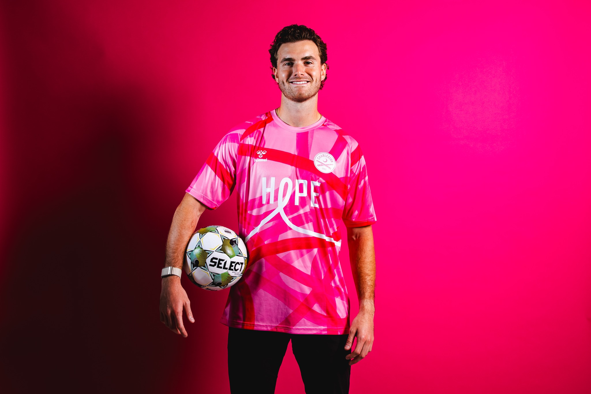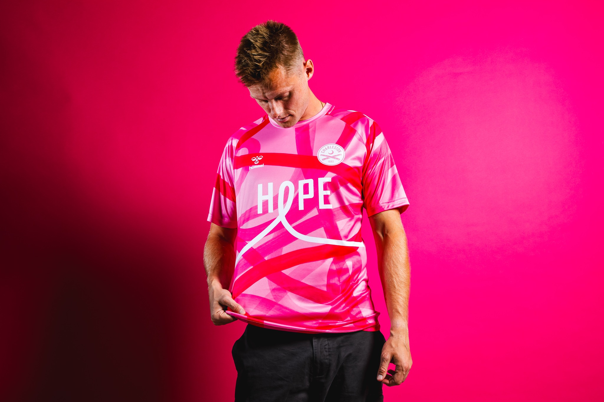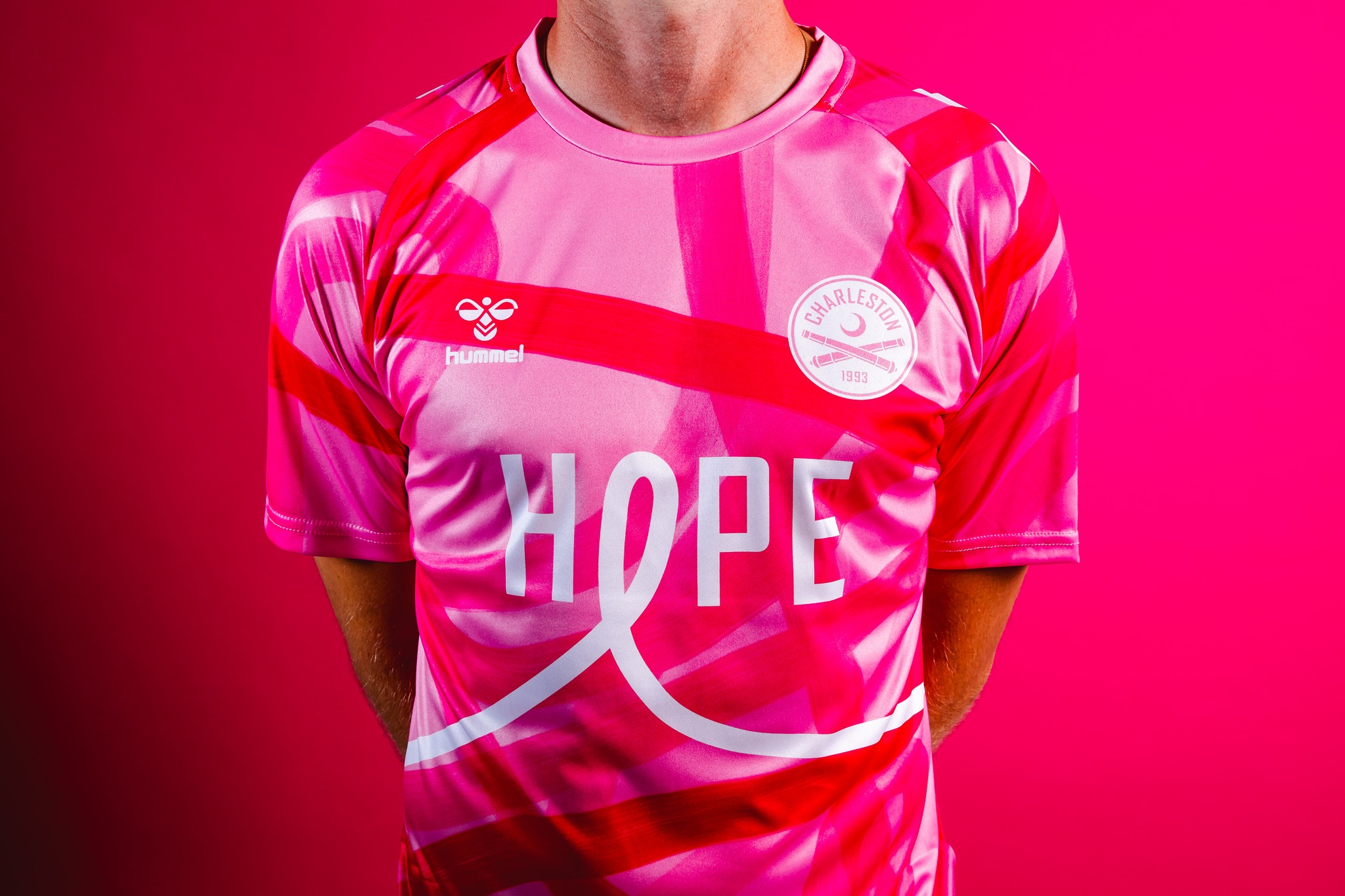 It features a pink base with an all-over abstract ribbon graphic, referencing the international symbol of hope and solidarity. The front features the word “HOPE” with the ribbon incorporated into the typography. Hummel’s logo appears on the right chest, with Charleston Battery’s crest in white on the opposite side.