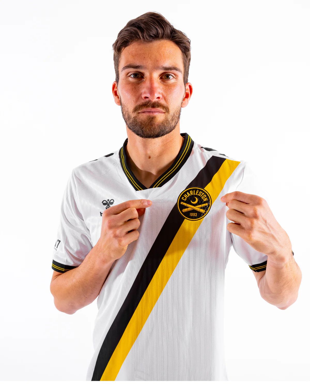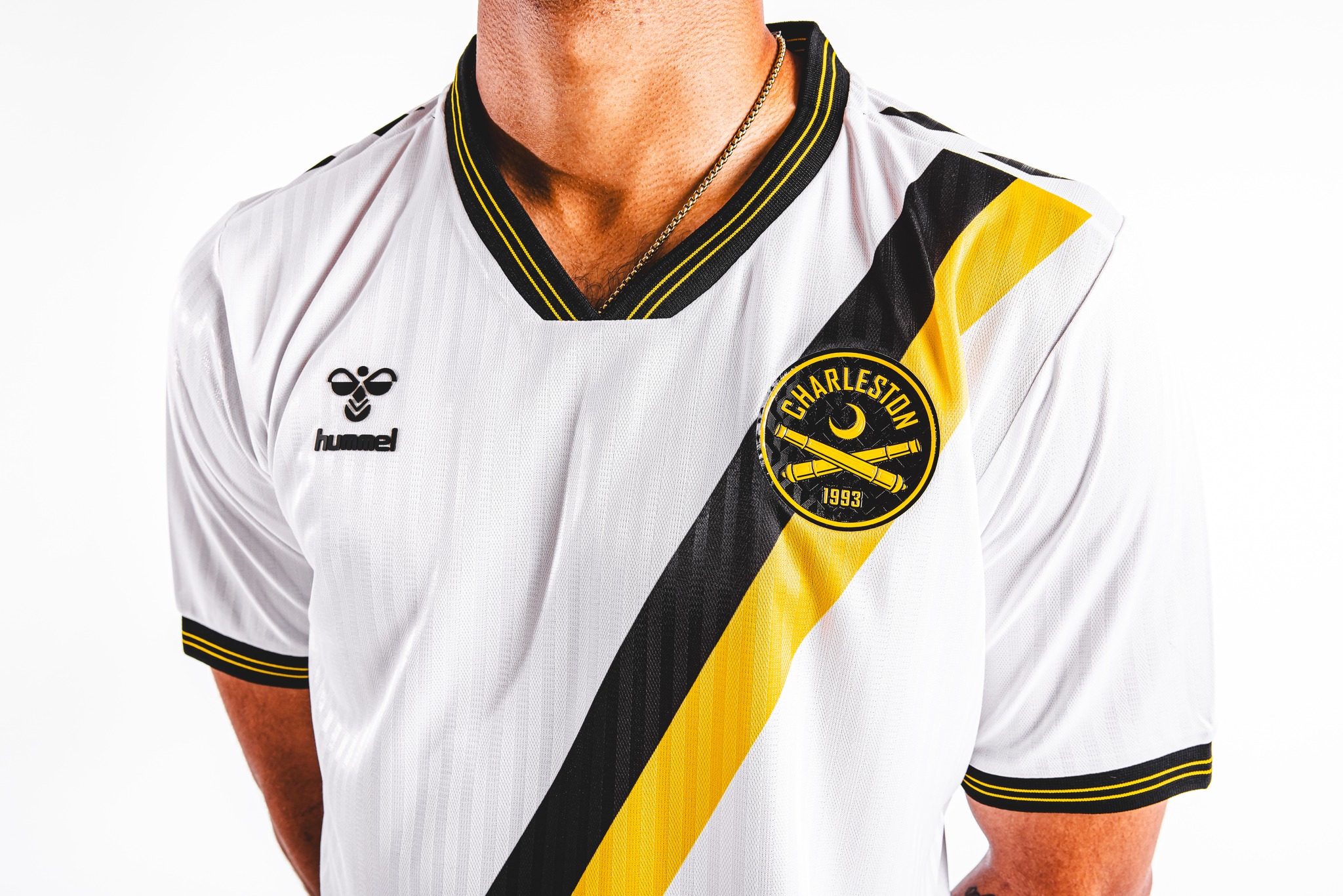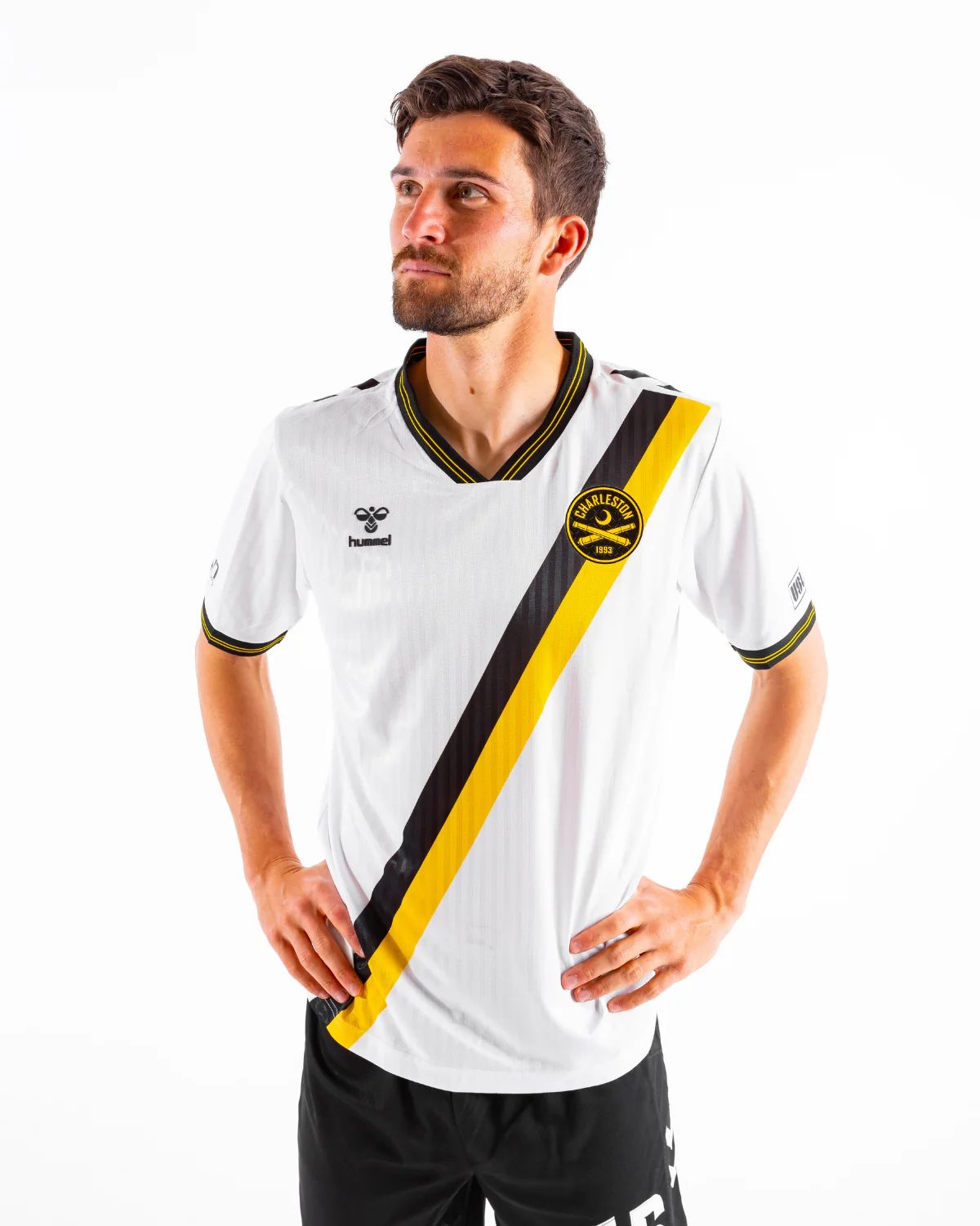 The new Charleston Battery jersey is white and features a bold black and yellow sash running from the right shoulder to the left hip. The crest sits over the sash on the left chest, while a rubberised hummel logo appears on the right.
