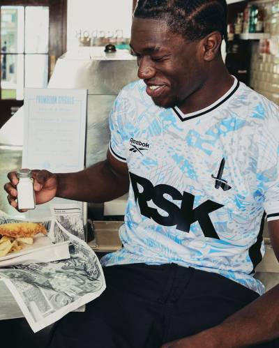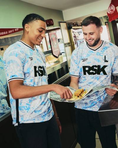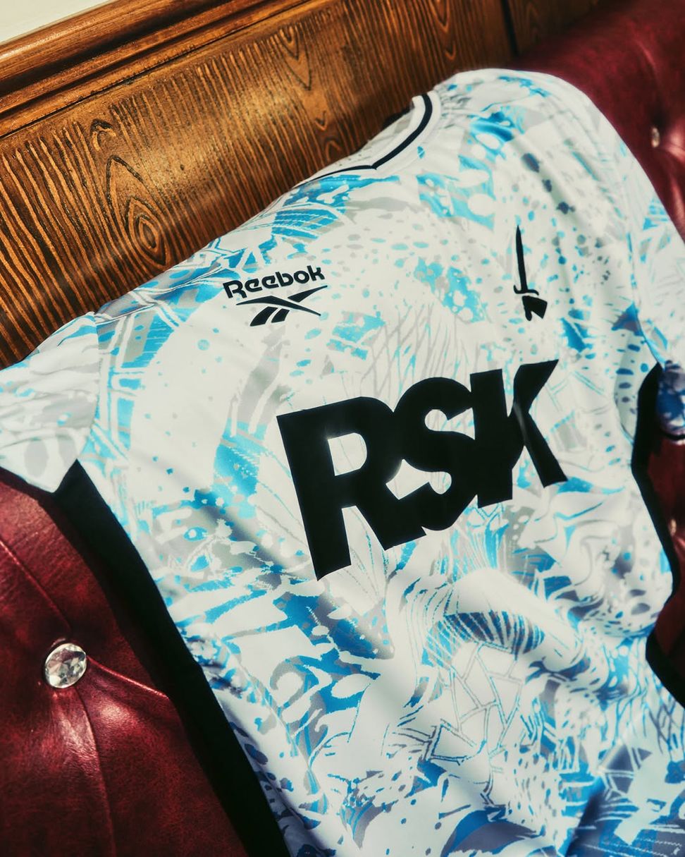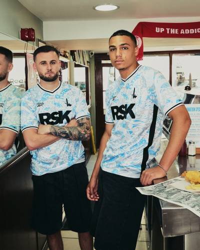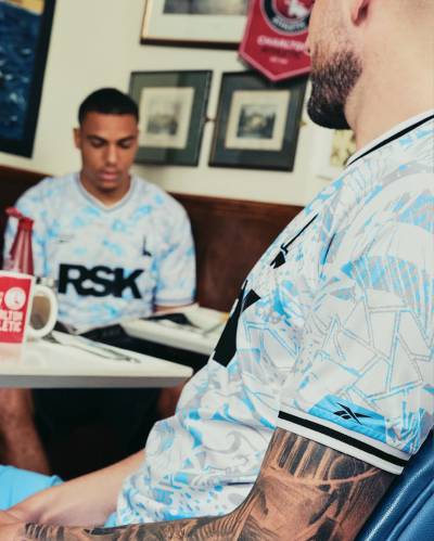 The shirt showcases a tonal aquatic blue, white, and grey fish scale graphic, a nod to club legend Arthur Bryan, a local fishmonger whose haddock meals inspired Charlton’s nickname, The Addicks, and who was one of the club’s earliest sponsors.