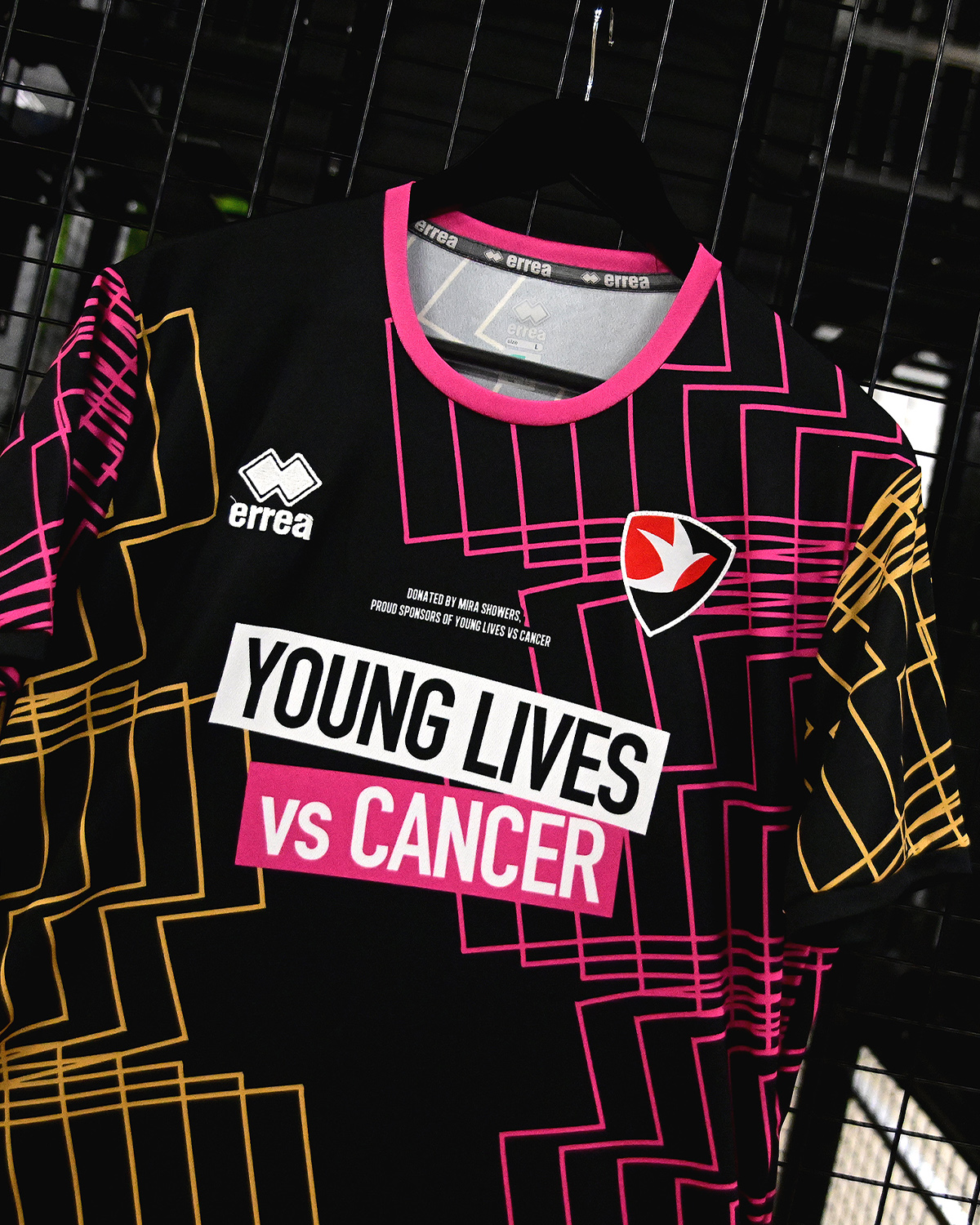 For a third consecutive season, Mira Showers have donated their front of shirt sponsorship to their official charity of the year. As a result, the standard sponsor branding is replaced by the Young Lives vs Cancer logo, reinforcing the club’s ongoing commitment to raising awareness and supporting the organisation’s work with young people affected by cancer.
