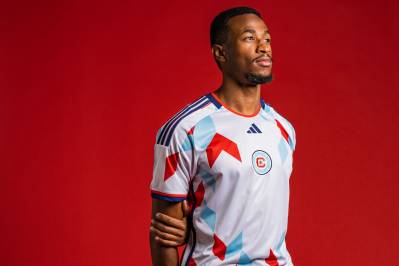 The state flag of Chicago was the main source of inspiration for the white jersey, which features accents of Fire red and navy blue on the sides, sleeves, and bottom.