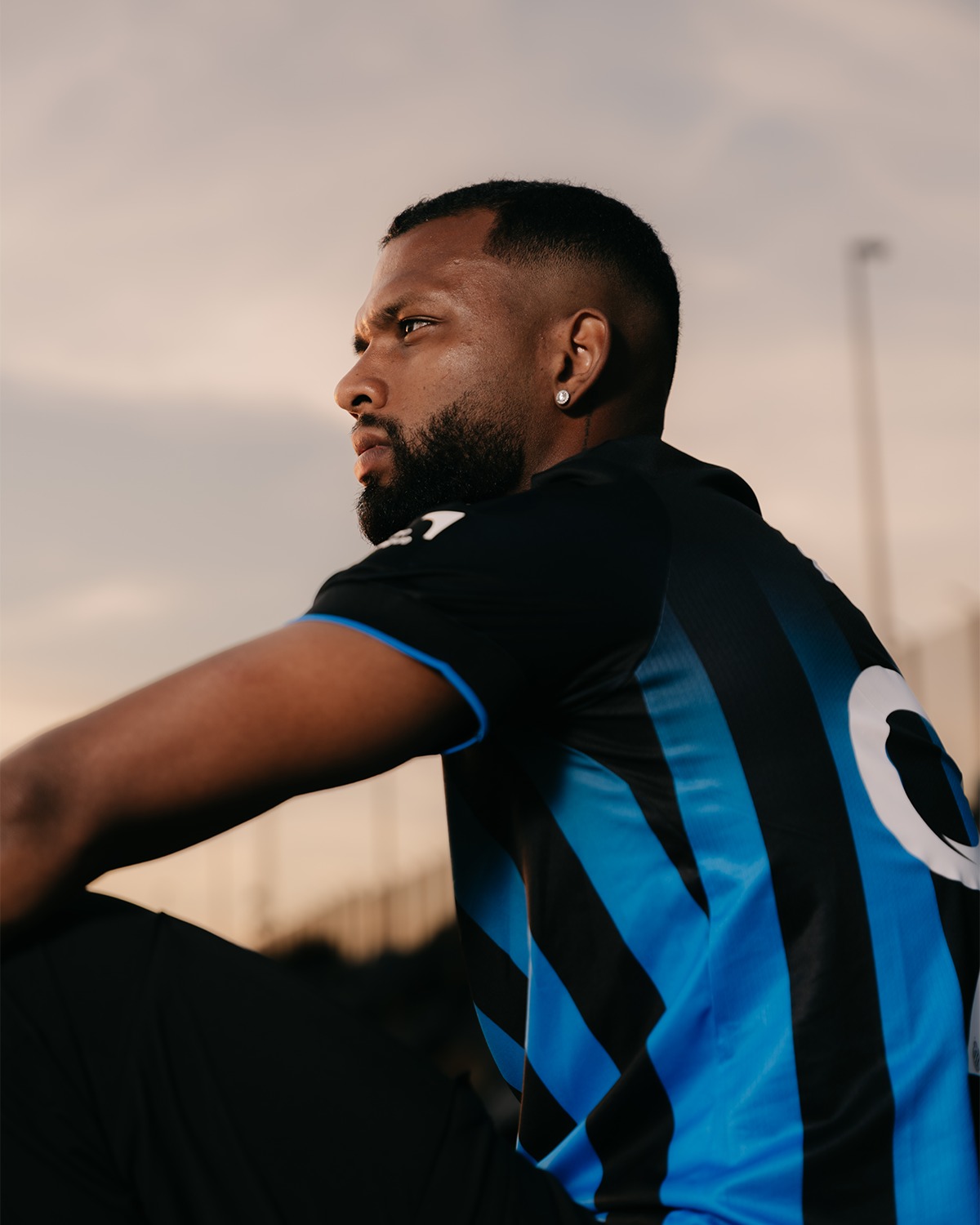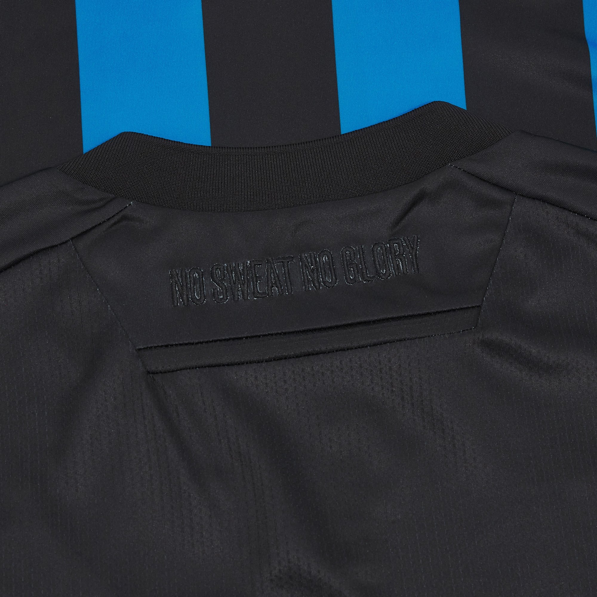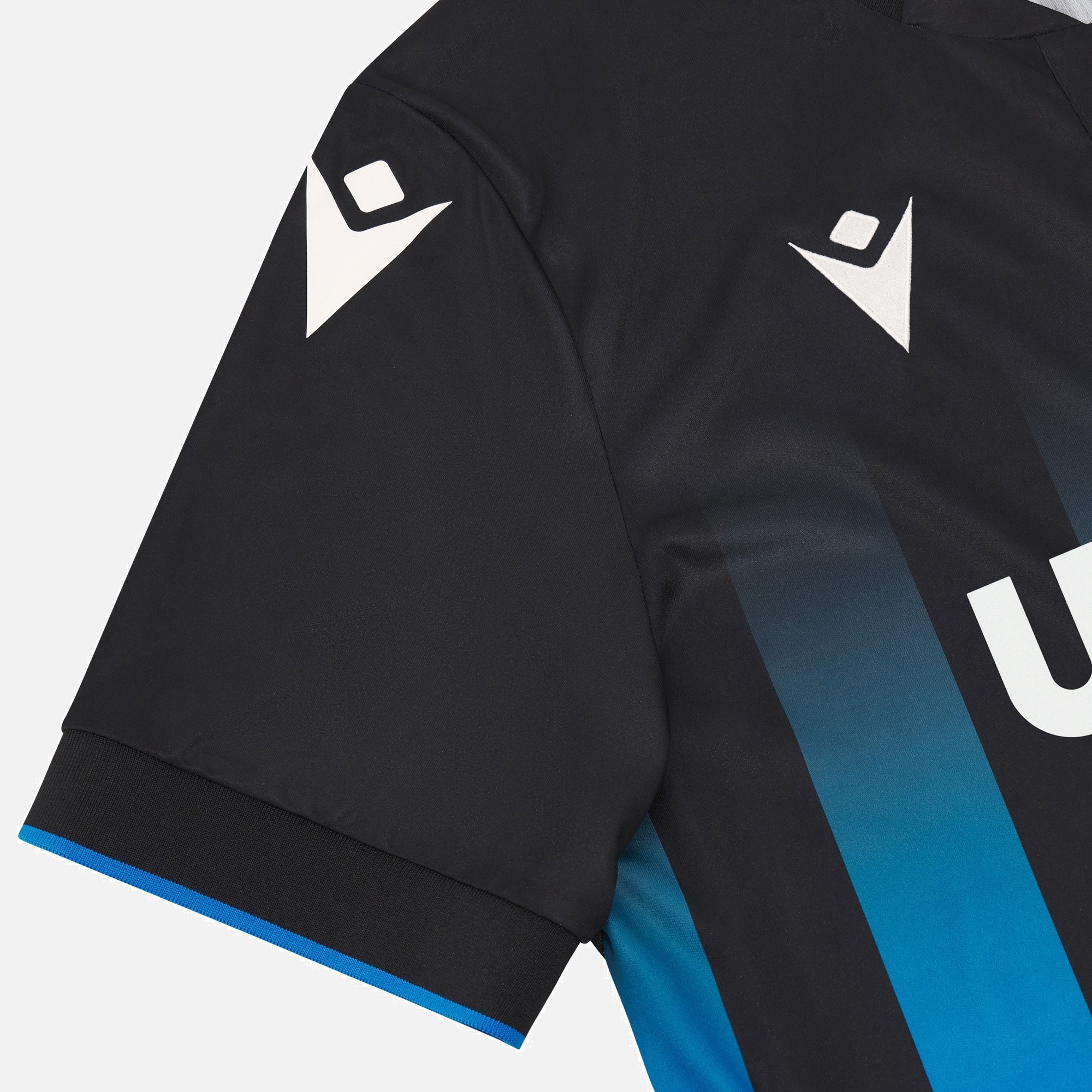 The 2023-24 primary release from Macron sees the famous blue and black stripes included in conjunction with a gradient effect, the result of which being the full-colour crest and supplier’s white “Hero” logos sitting on plain black.