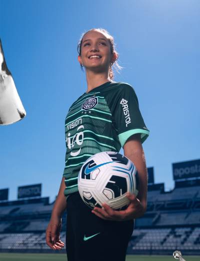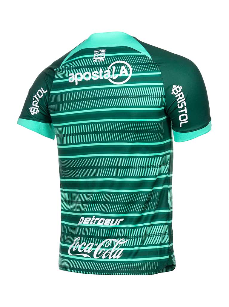 The new secondary-change design from Nike combines mint-green graphical embellishment with a dark-green base, while the crest is in the familiar black and white and the partner logos are also white.