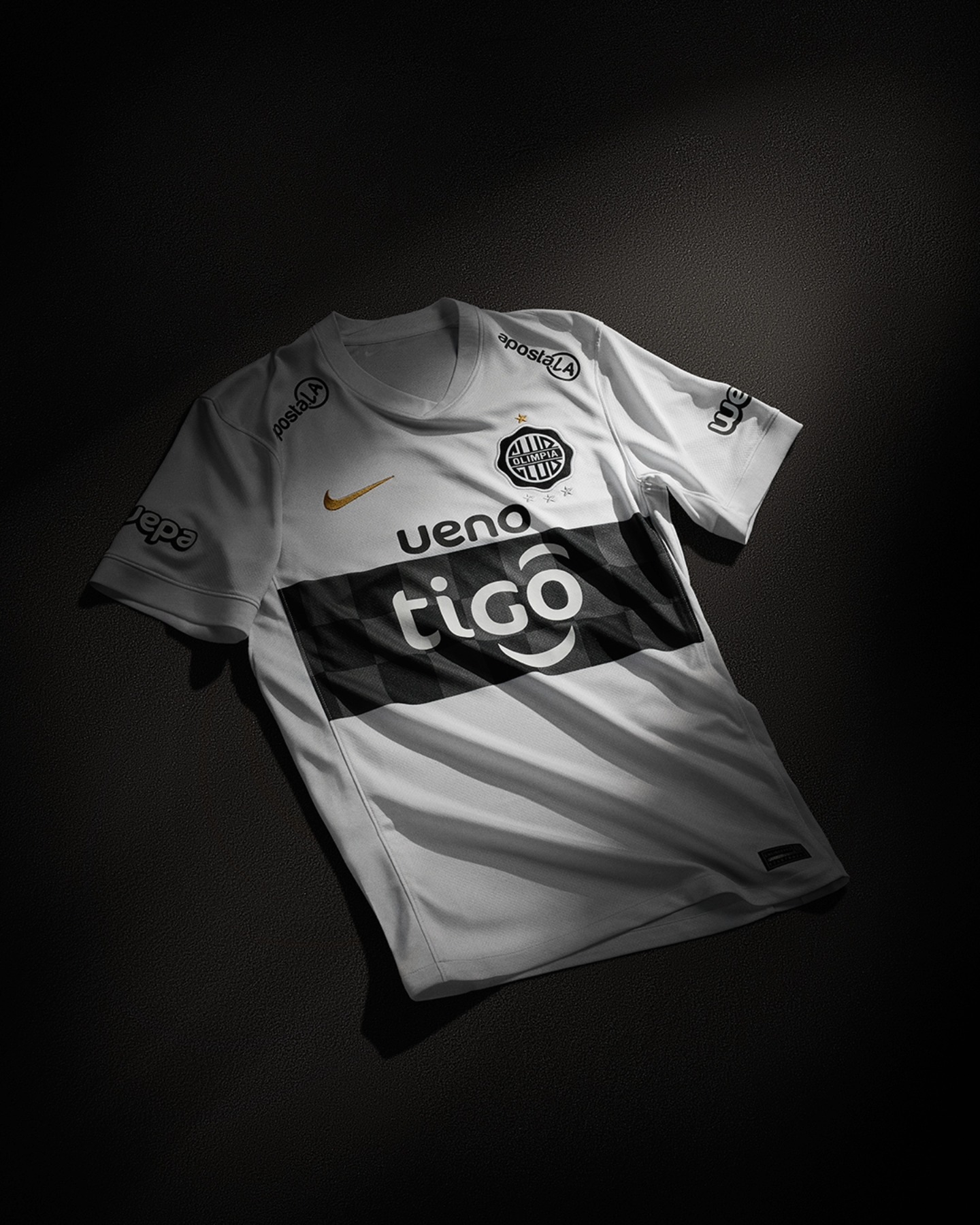 The Club Olimpia football shirt retains El Decano’s established white base, paired with the traditional black horizontal chest band. Within the band, a subtle checkered pattern is integrated, while Nike branding appears in metallic gold on the chest alongside the club crest, with shirt sponsor Tigo applied across the front in line with competition regulations.