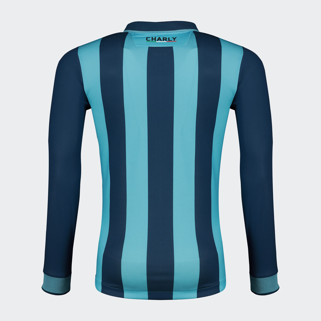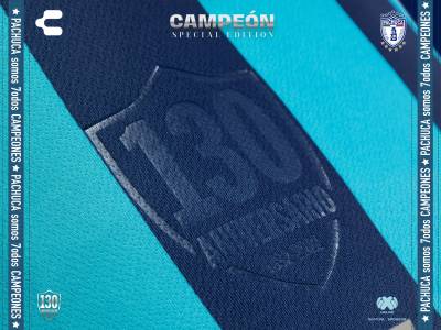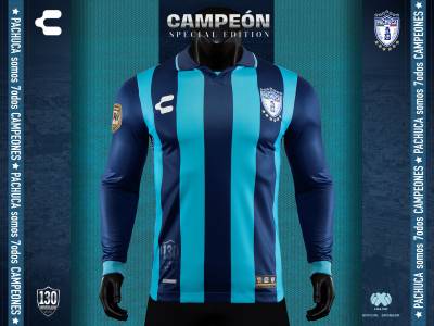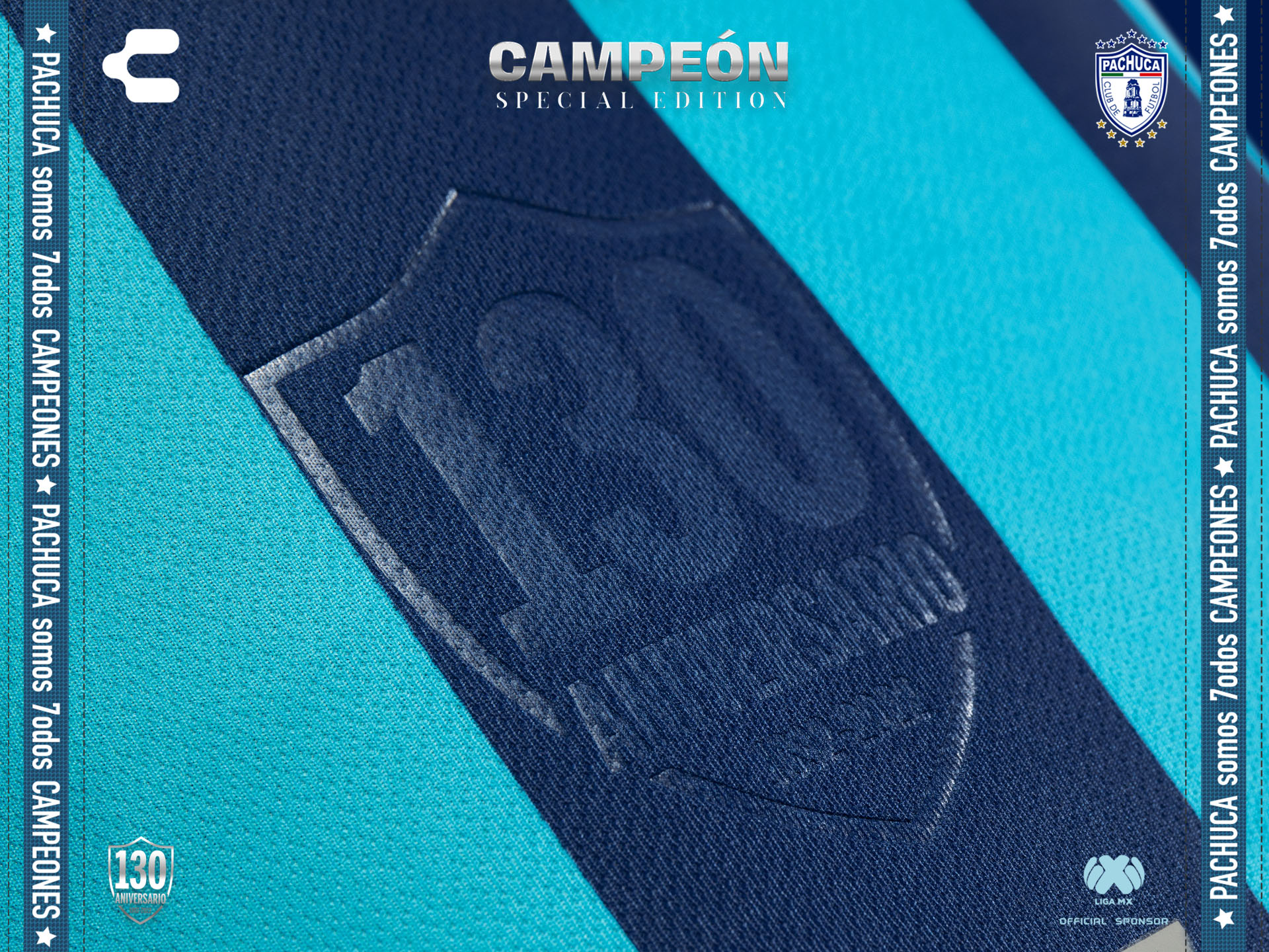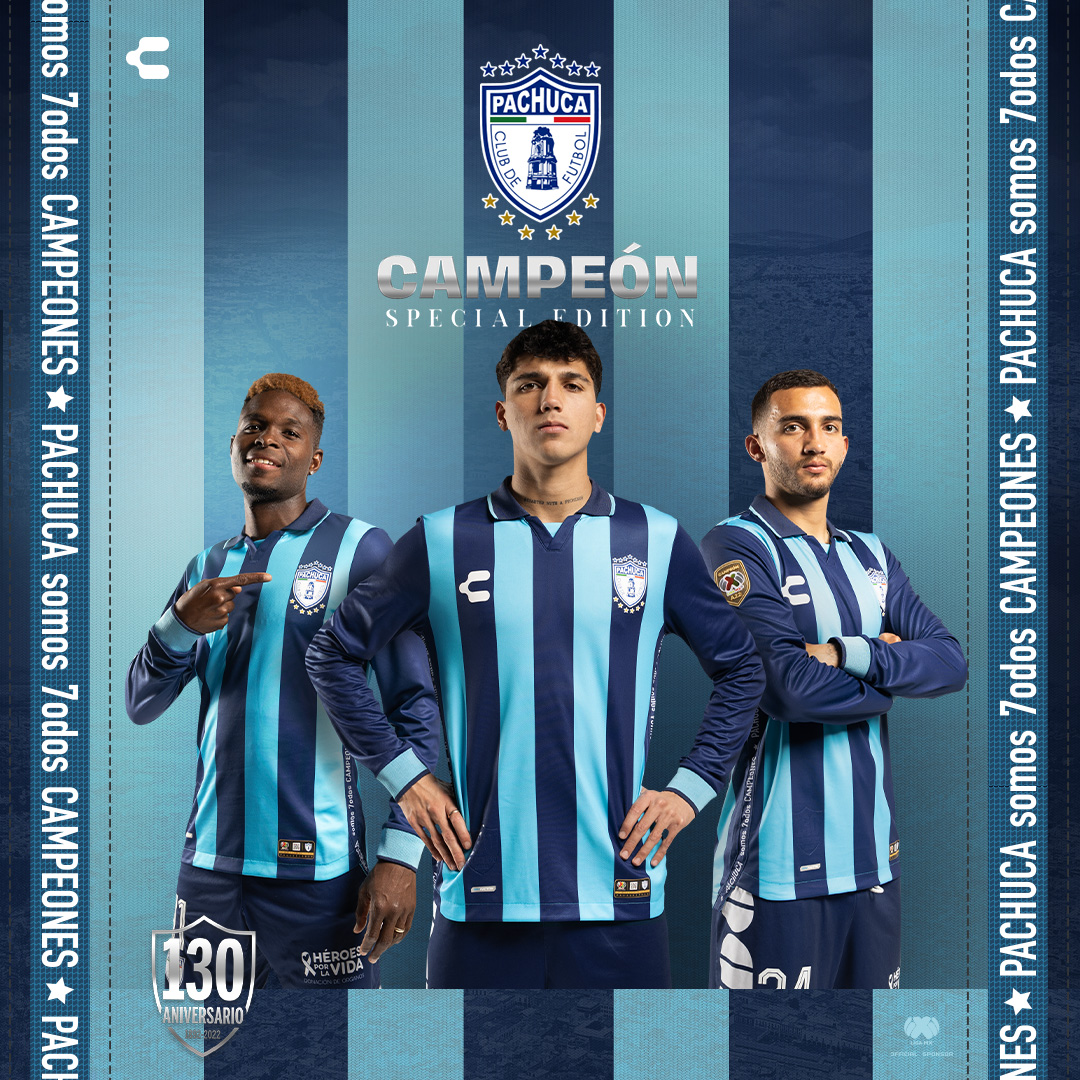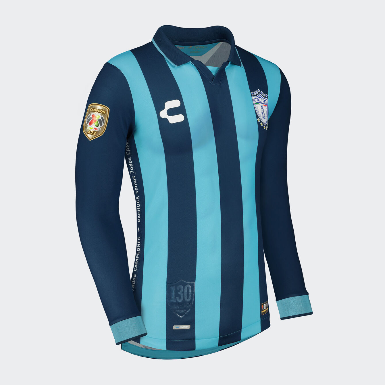 The new commemorative shirt celebrates recent Pachuca’s Liga MX triumph and the Mexican side’s 130th anniversary in the form of a classically styled navy-and-sky-blue Charly design with a collar.