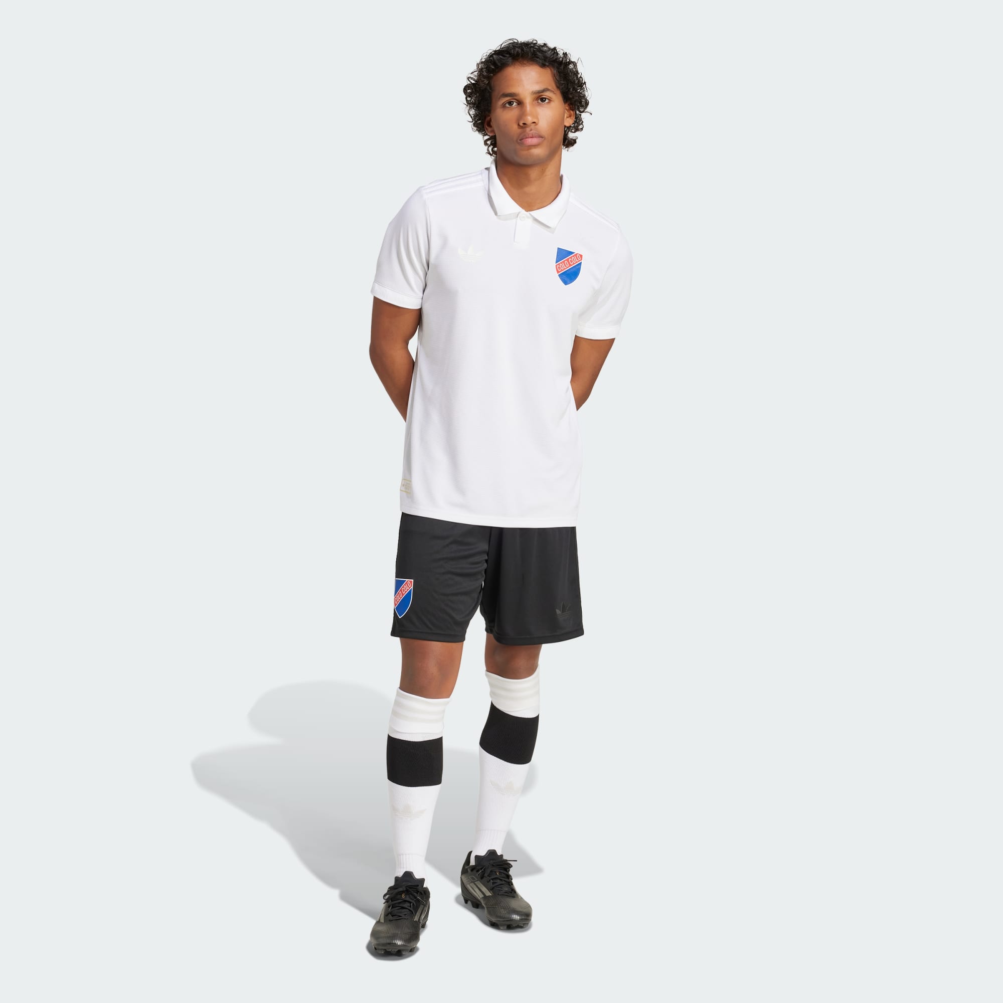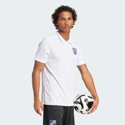 The shirt features a clean white base with a classic polo collar, inspired by the kit worn by Colo-Colo's first squad. A pattern of small crosses is woven into the collar as a tribute to Bar Quitapenas, the place where the club was first envisioned.