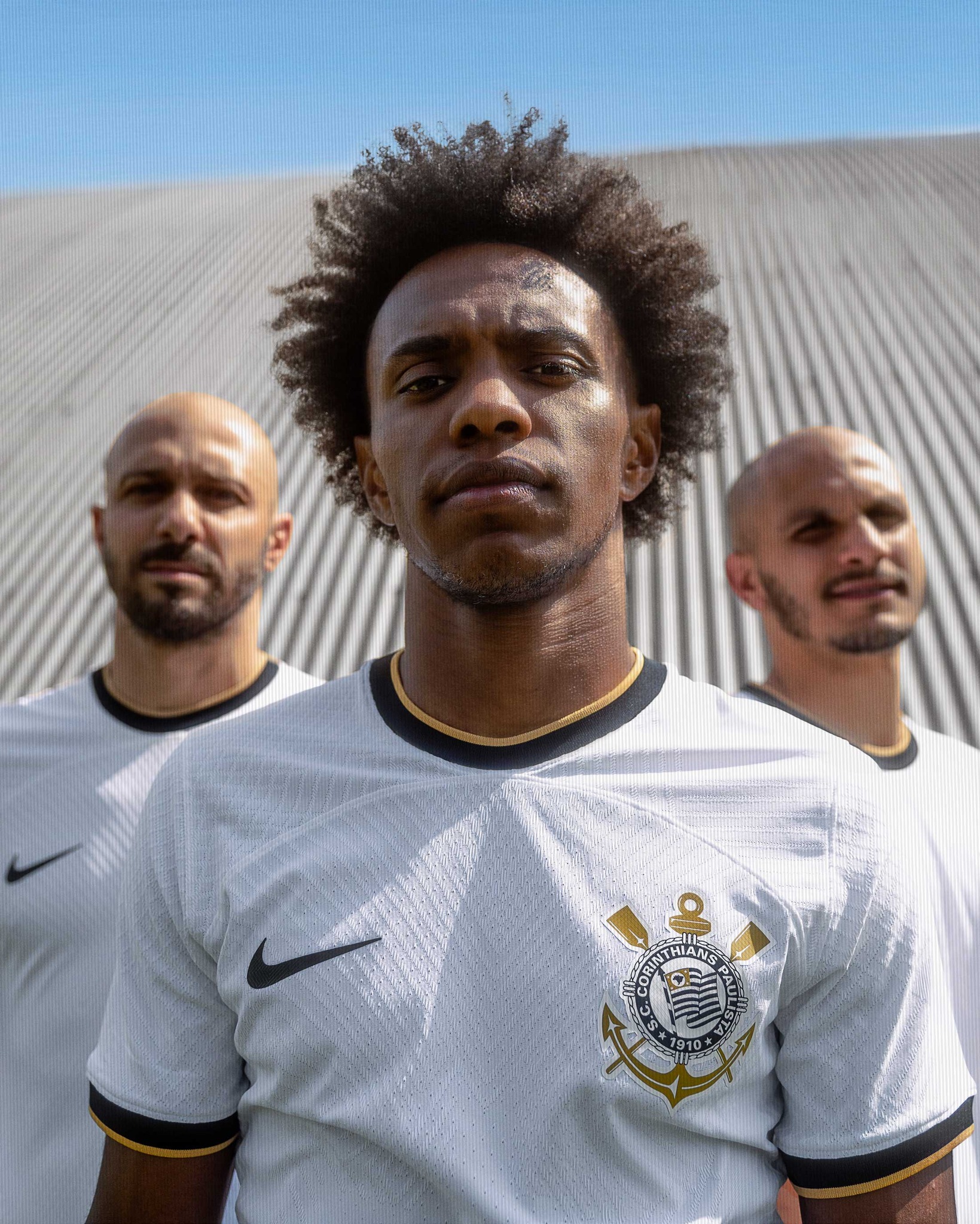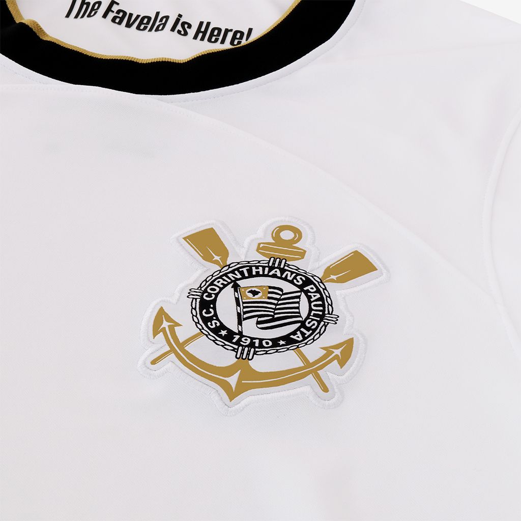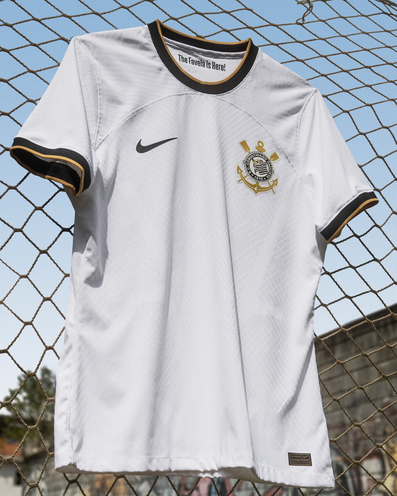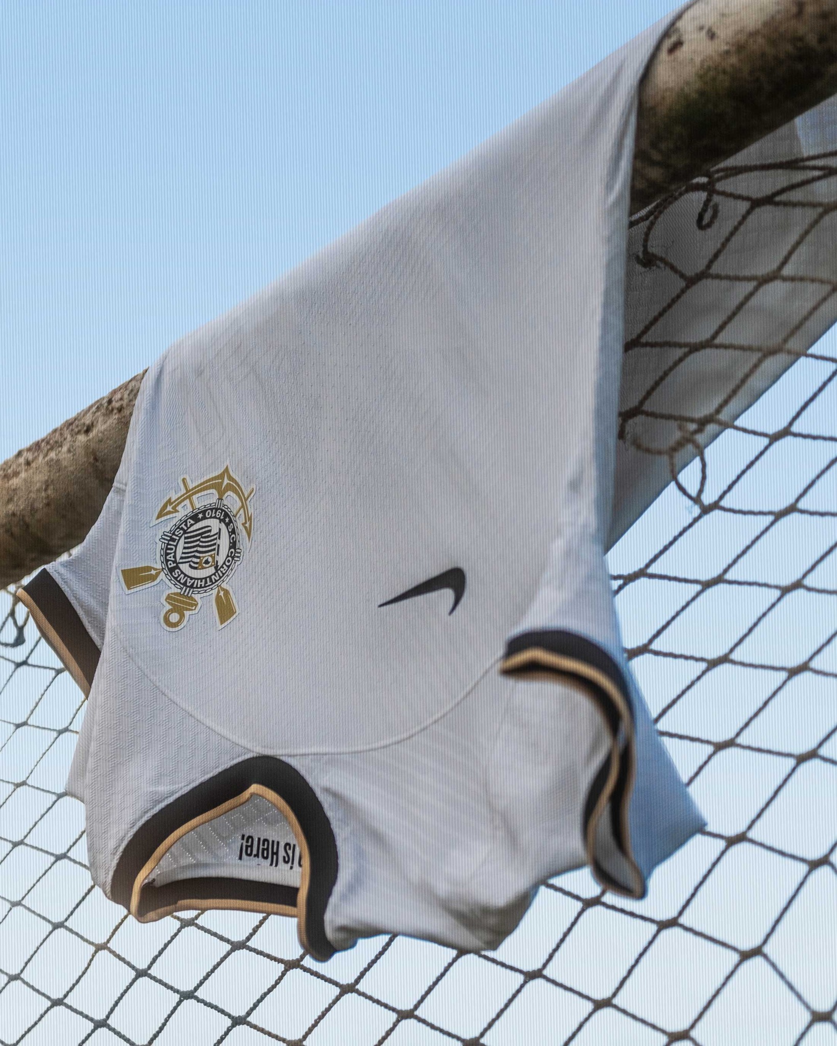 The palette, which extends to the stylings of the crest, has been deployed in order to make reference to the tenth anniversary of Corinthians’ 2012 Copa Libertadores and Club World Cup triumphs (in their “Golden Year”).