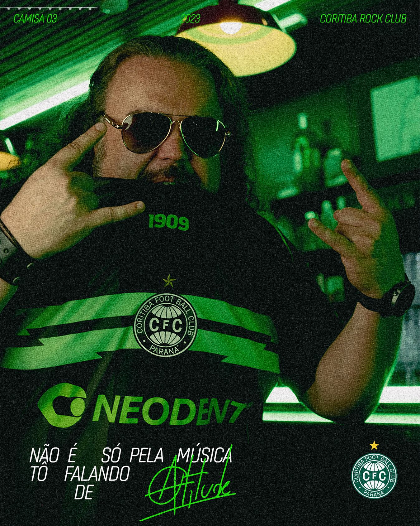 Nodding to Coritiba’s Estádio Major Antônio Couto Pereira ground’s reputation as rock music venue, the “1909”-branded in-house secondary-change release is in black with the fervent support honoured in green detailing - including lightning-bolt-styled horizontal banding - alongside a guitar pick (plectrum) transfer and a QR code for a Spotify rock playlist.