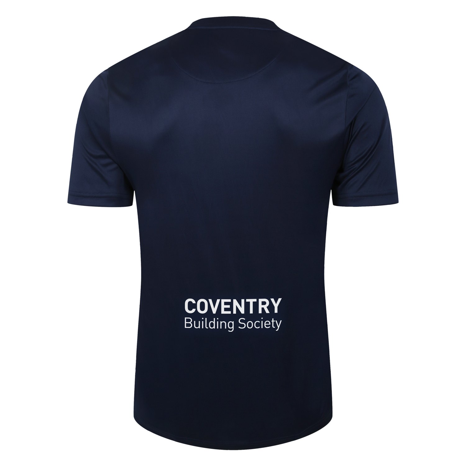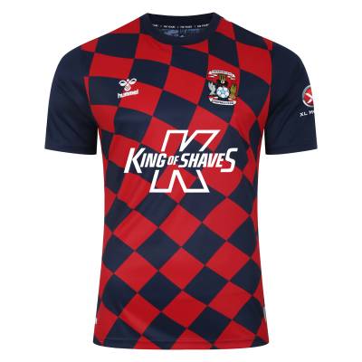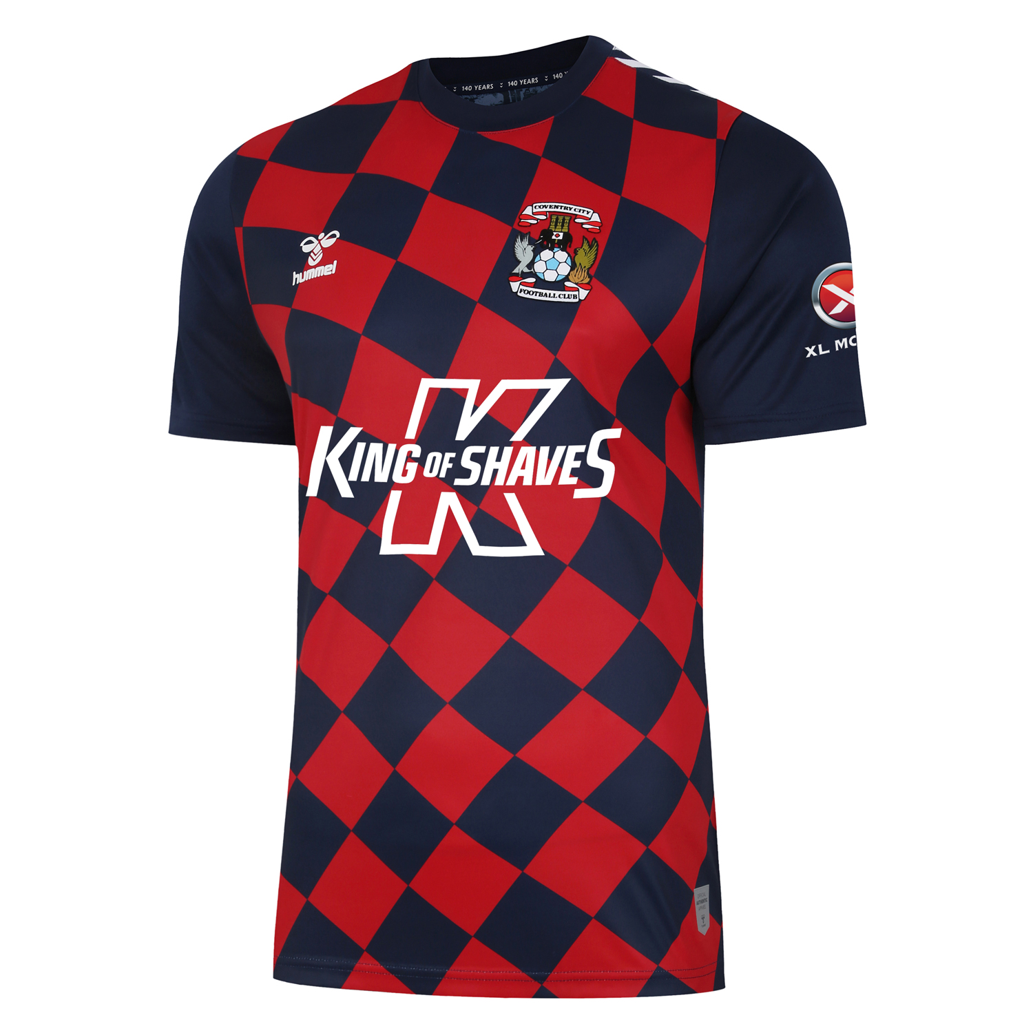 The shirt features navy blue sleeves and a navy blue back, complemented by the principal partner, King of Shaves, logo on the front. Sponsors XL Motors grace the sleeves, while Coventry Building Society is showcased on the shirt's back, and G&R Scaffolding appears on the shorts.
