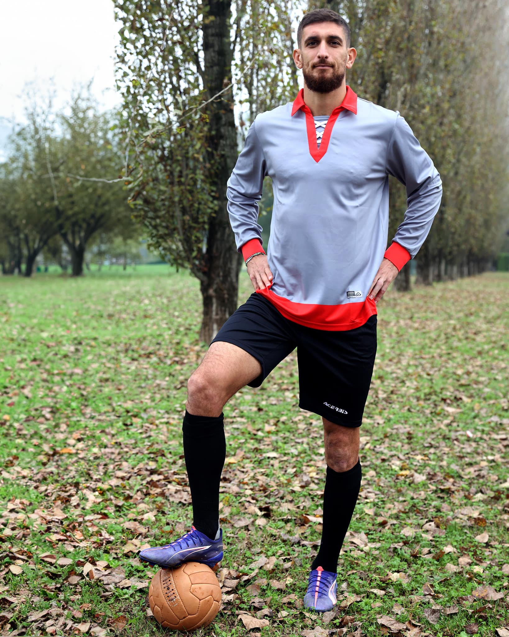 The kit, created with technical sponsor Acerbis, features a grey interlock body and honeycomb-textured sleeves, with a contrasting red collar and cuffs. A horizontal band at the bottom nods to the club’s early uniform elements. The goalkeeper’s version inverts the colours for distinction.