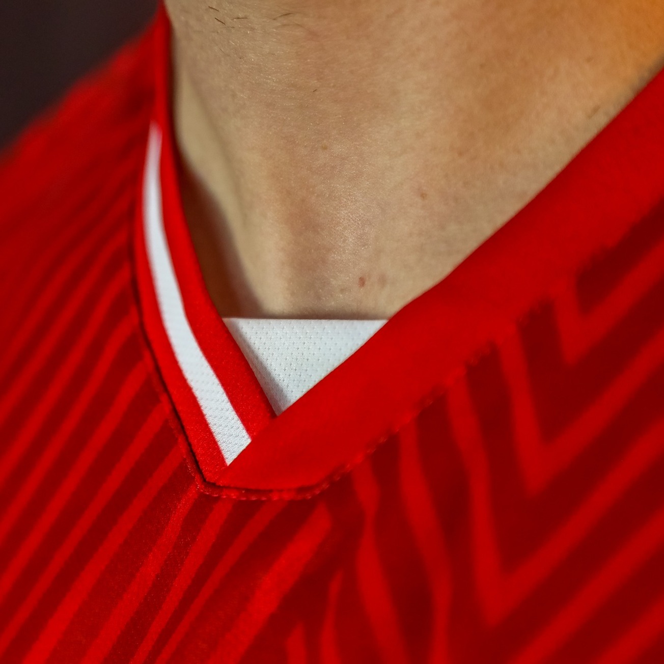 The sleeves are plain red and white trim is kept to a modern decoration to the neck, cuff edging and panels to the side of the trunk. With a full-colour crest in its white-shield form, the shirt is combined with white shorts and red socks to complete the kit.