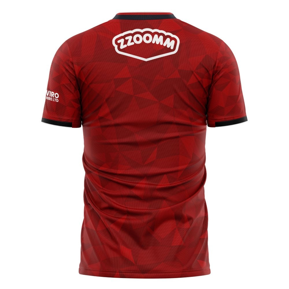 The red patterned shirt is trimmed with black and white and has white detailing - including on the crest and the logos/branding of the partners/sponsors - and the kit will be completed with complementing shorts and socks.
