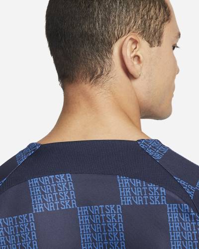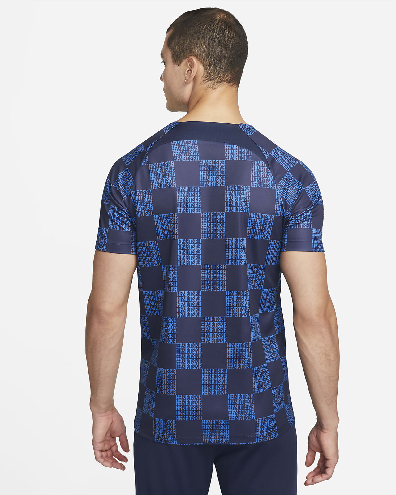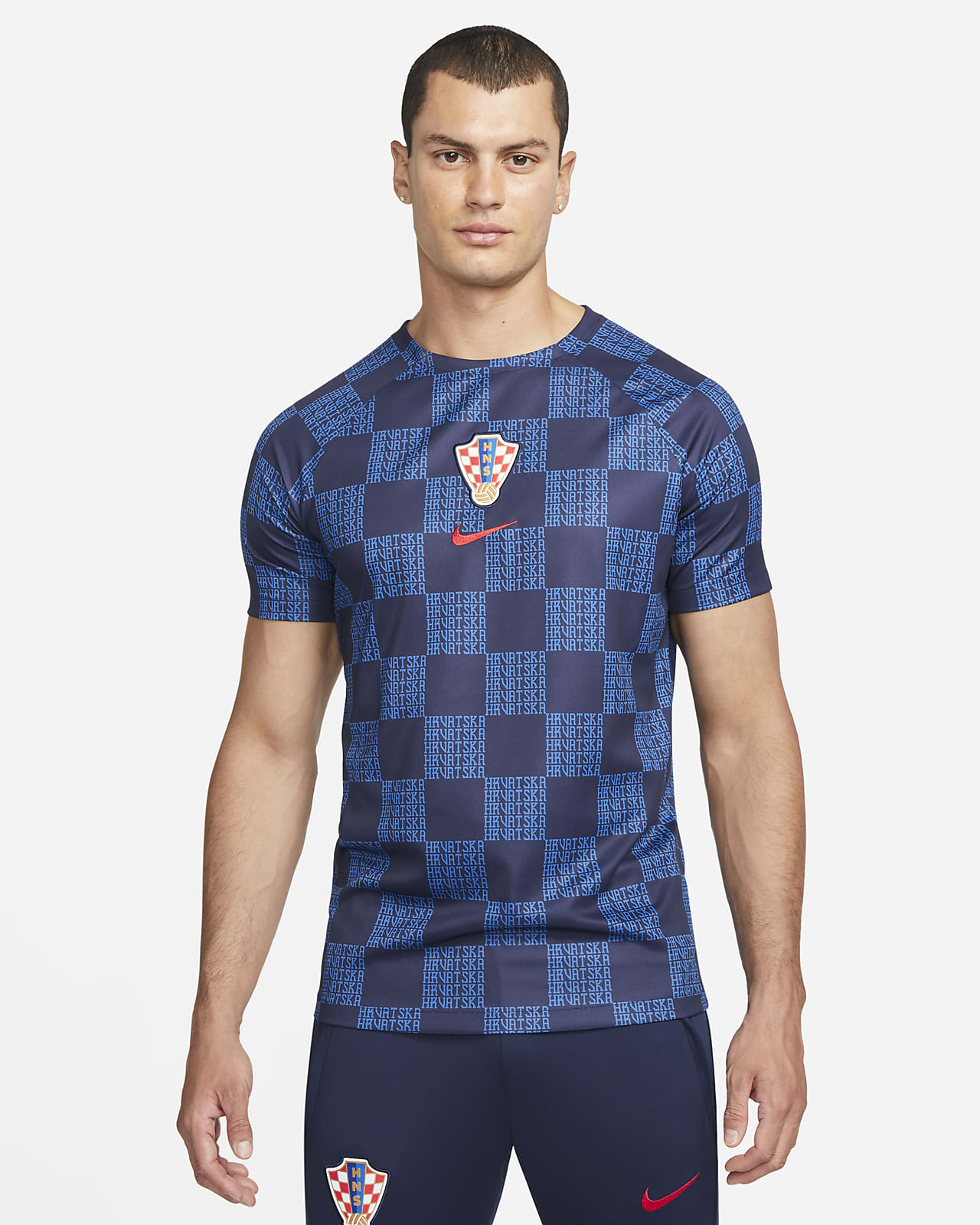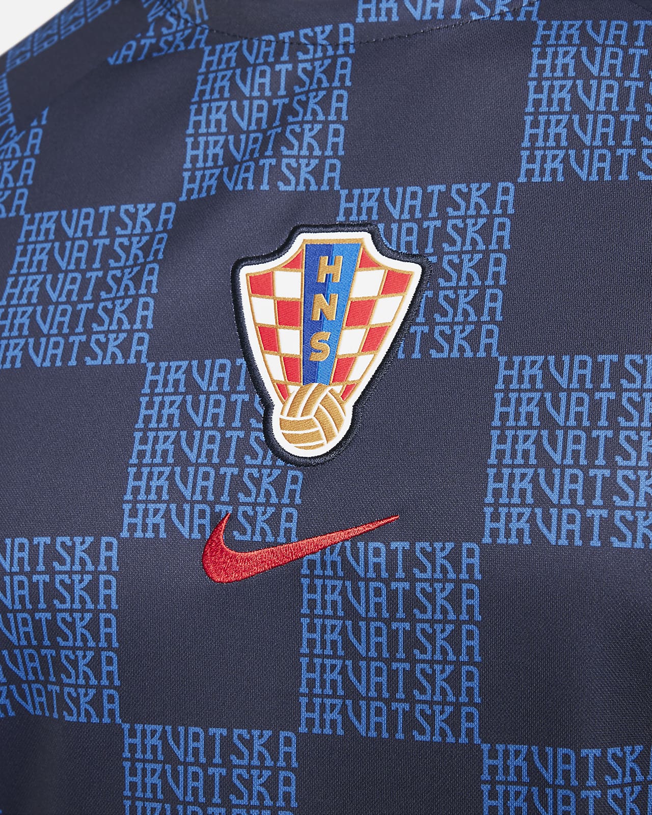 The 2022 warmup release from Nike is in “Blackened Blue” while another tone of blue provides a repetition of “HRVATSKA” (“Croatia” in Croatian) which forms the familiar chequerboard look. This is in turn overlaid with - placed centrally - the red Swoosh logo and the national team crest in full colour.