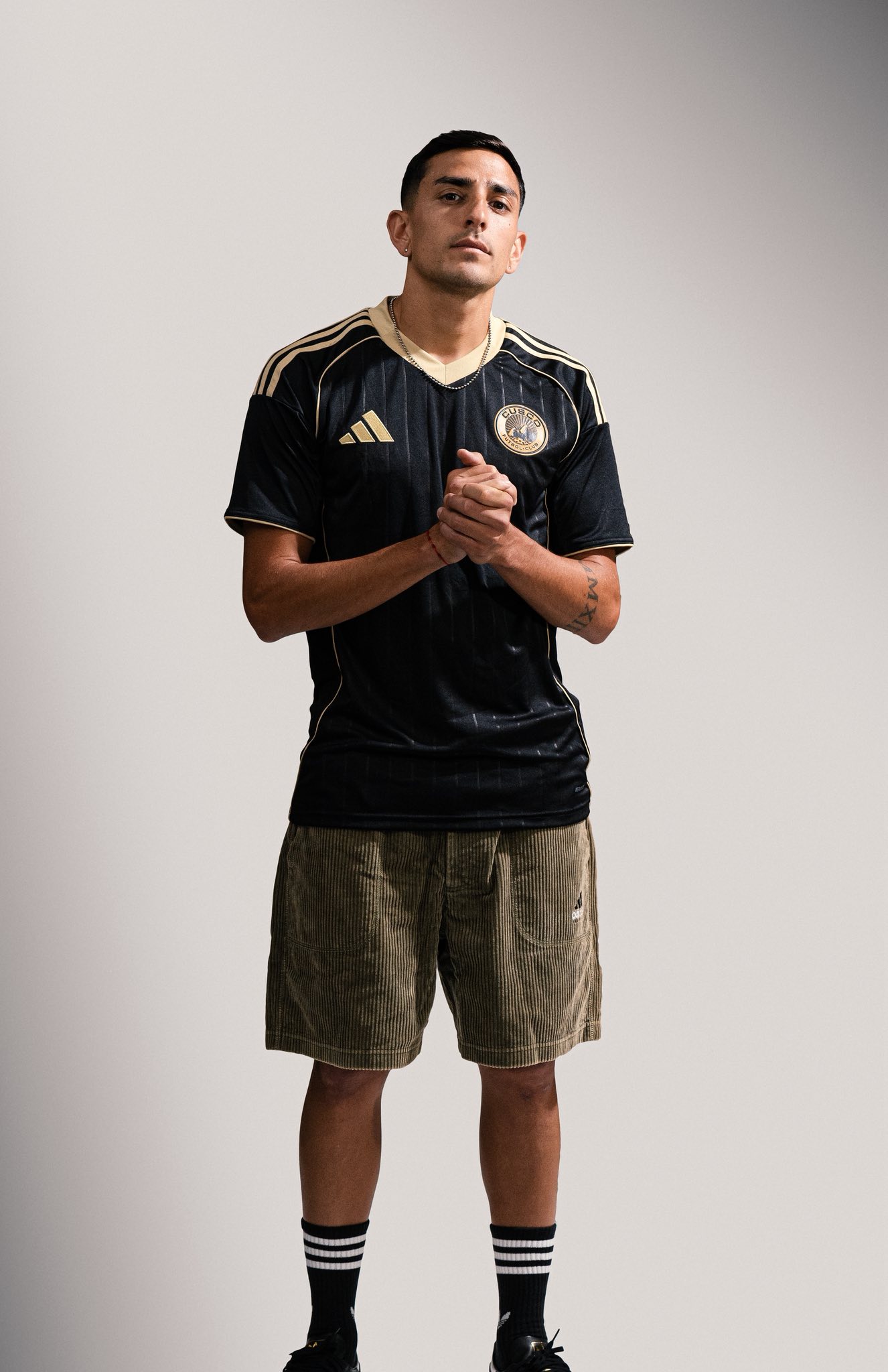 The Cusco Away shirt switches to a black base, with subtle vertical detailing visible through the fabric, alongside gold adidas branding, including the signature shoulder stripes. The Cusco FC crest appears in full colour on the chest, while the collar adopts a V-neck construction.