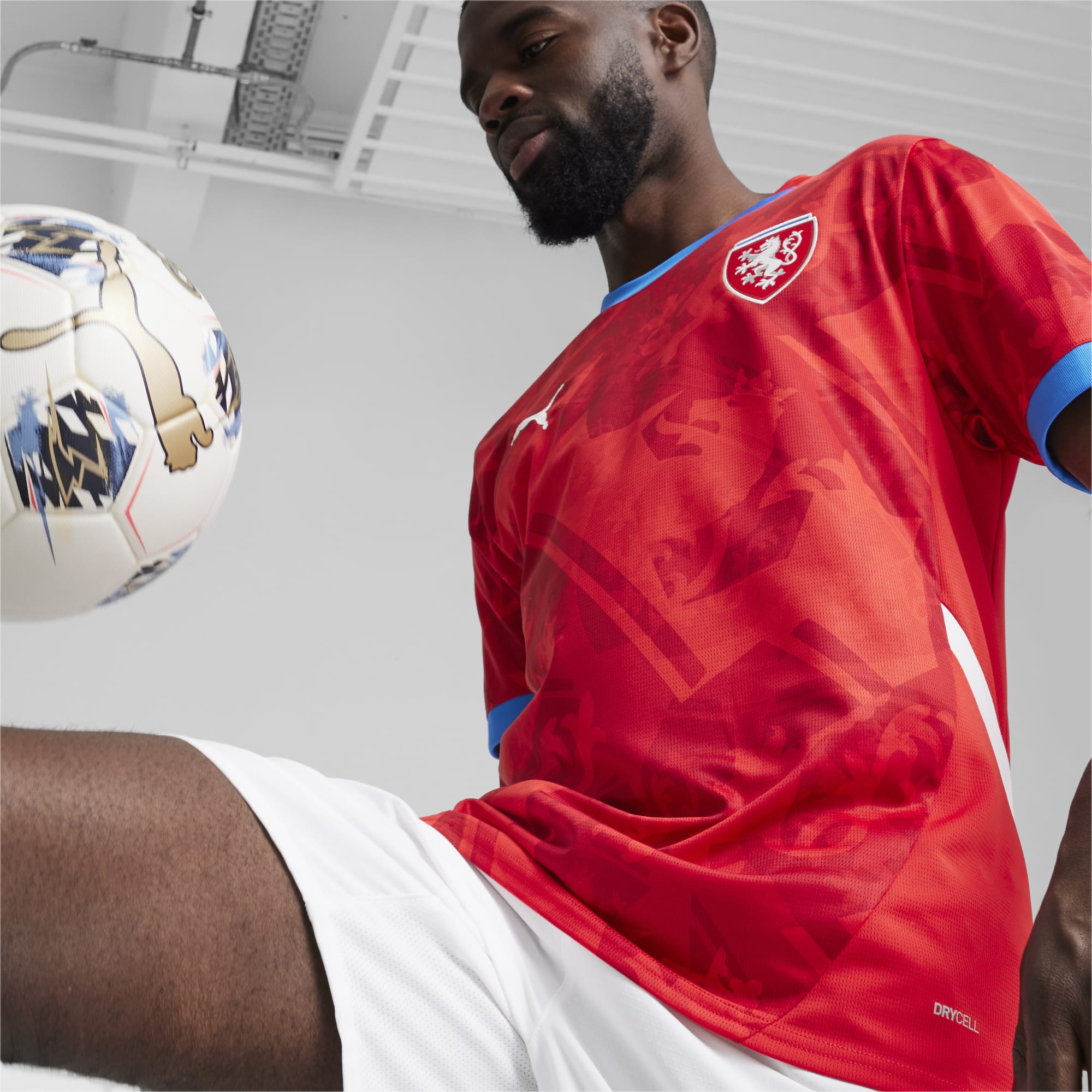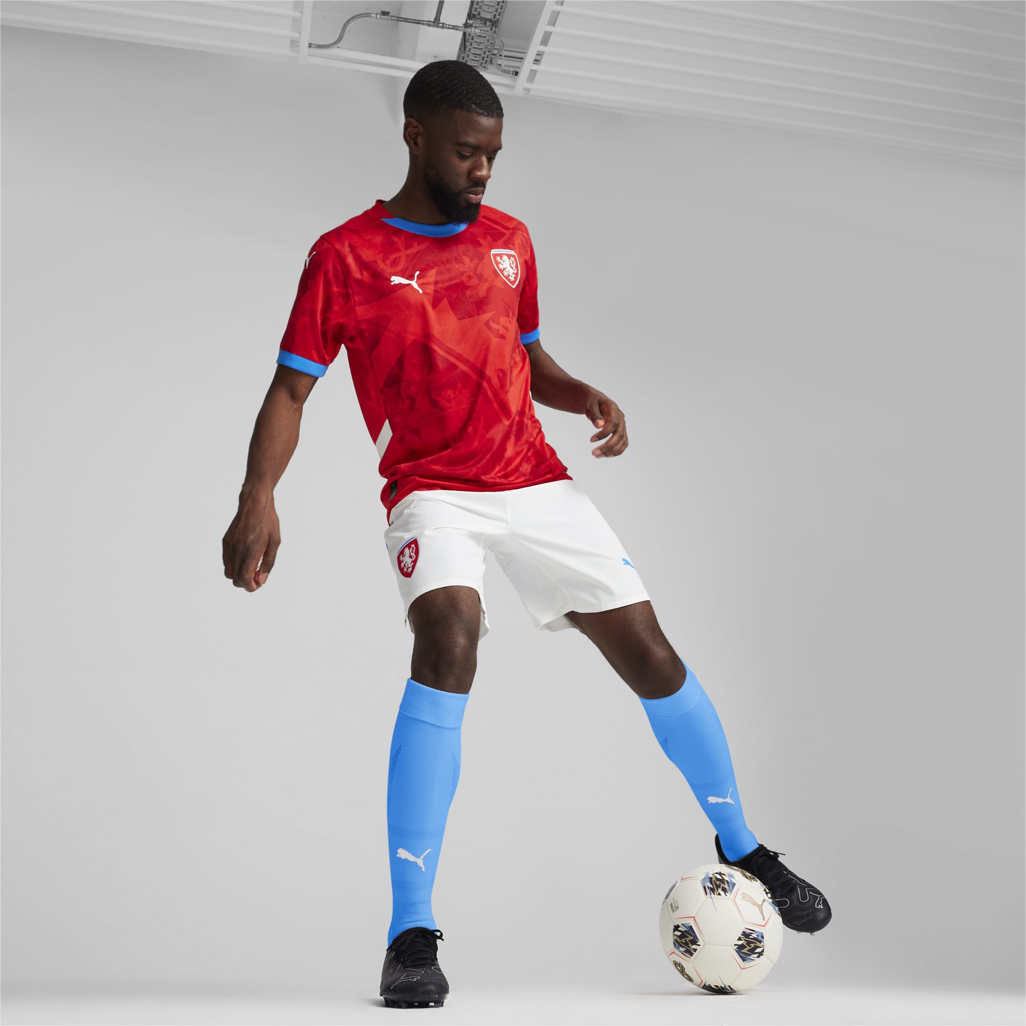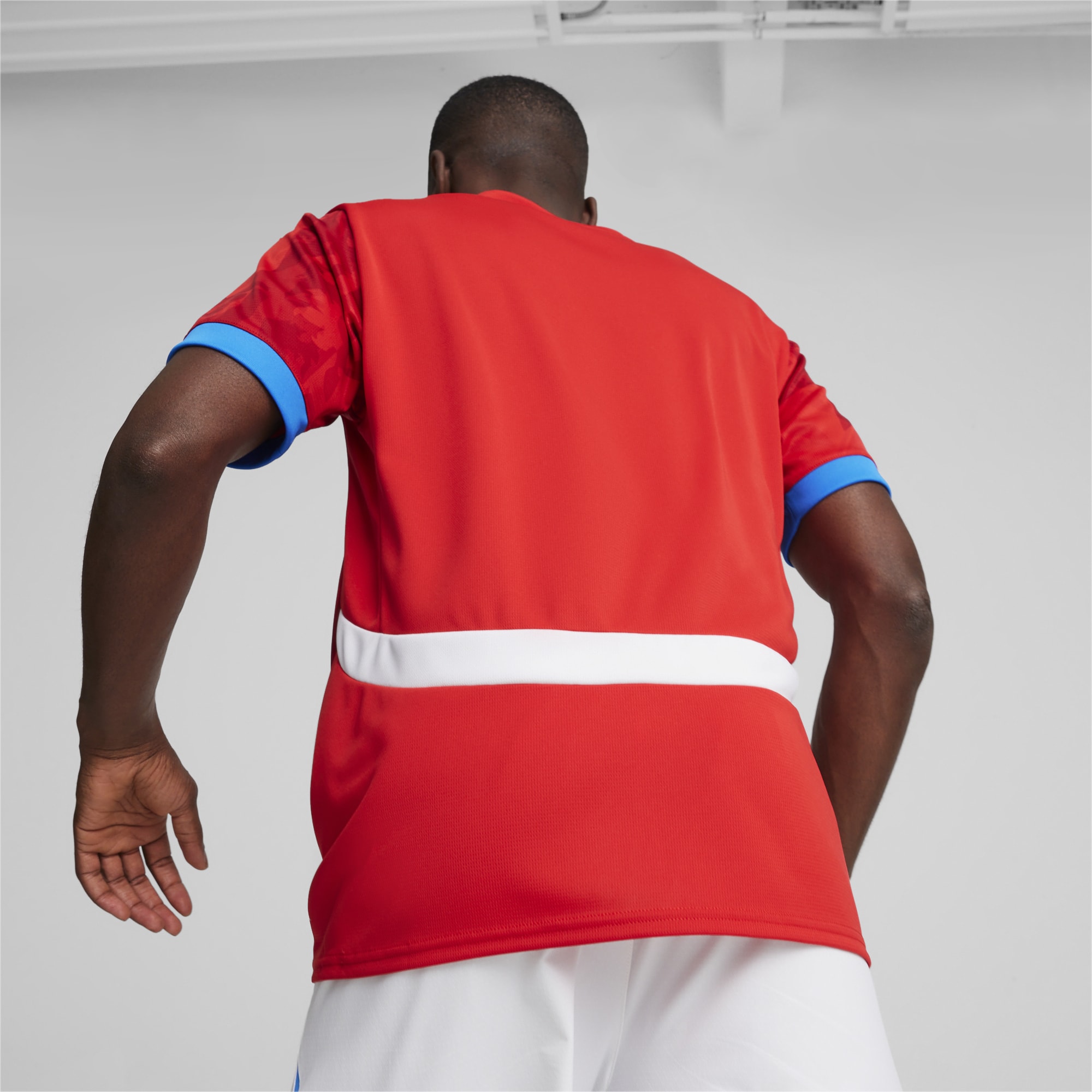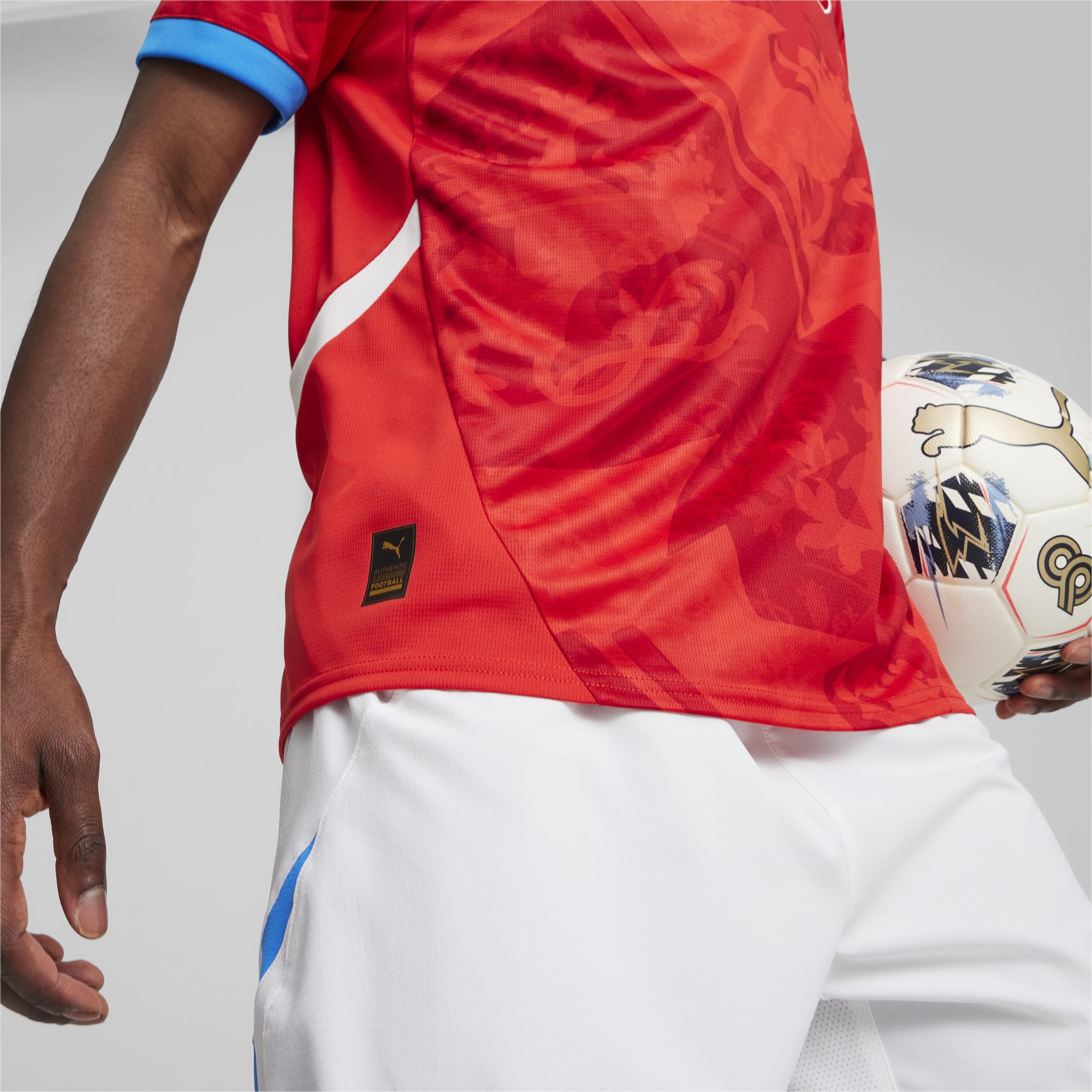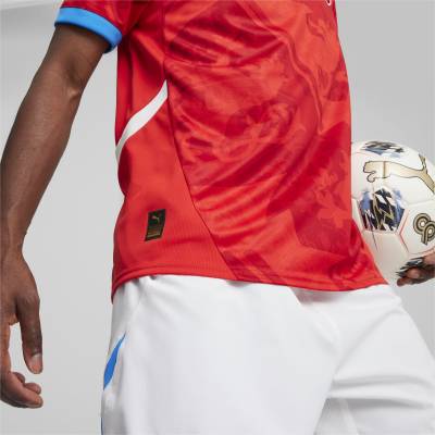 In red - officially, “For All Time Red” and “Fast Red” - has a sublimated base graphic that takes its cues from the crest while trim on the new Puma “RE:FIBRE” sustainability-focusing release is in light blue and white.