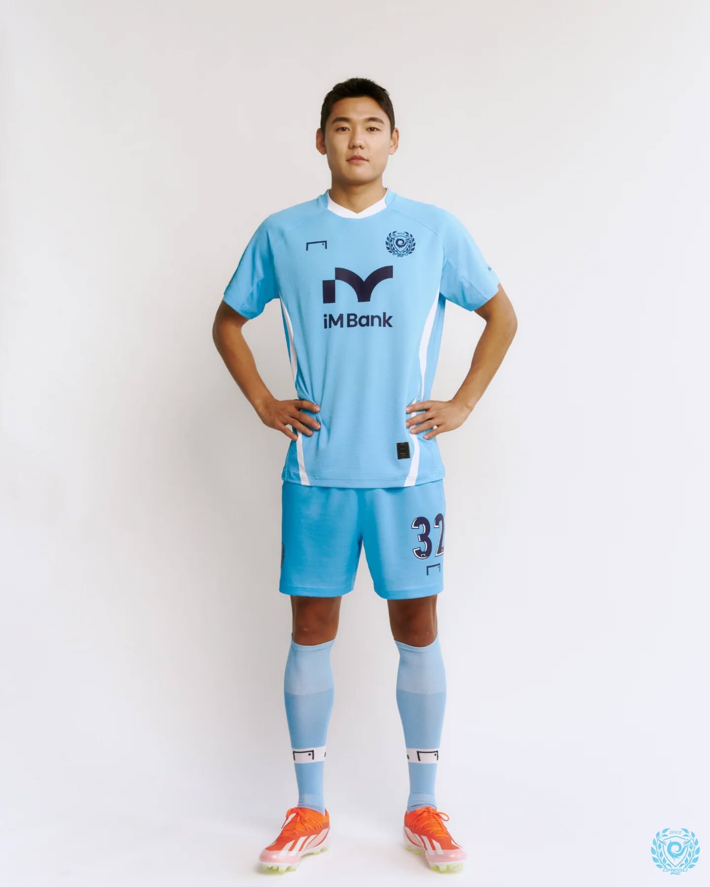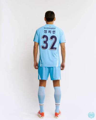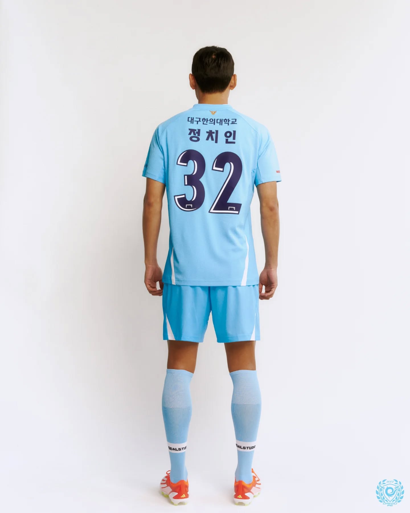 The 2025 Goal Studio primary release is in sky blue with white trim suggestive of the adidas Teamgeist releases of 2006, while the change - in the same template - has white embellished with navy blue and is marketed as representing clouds in the sky in relation to the Daegu FC identity.