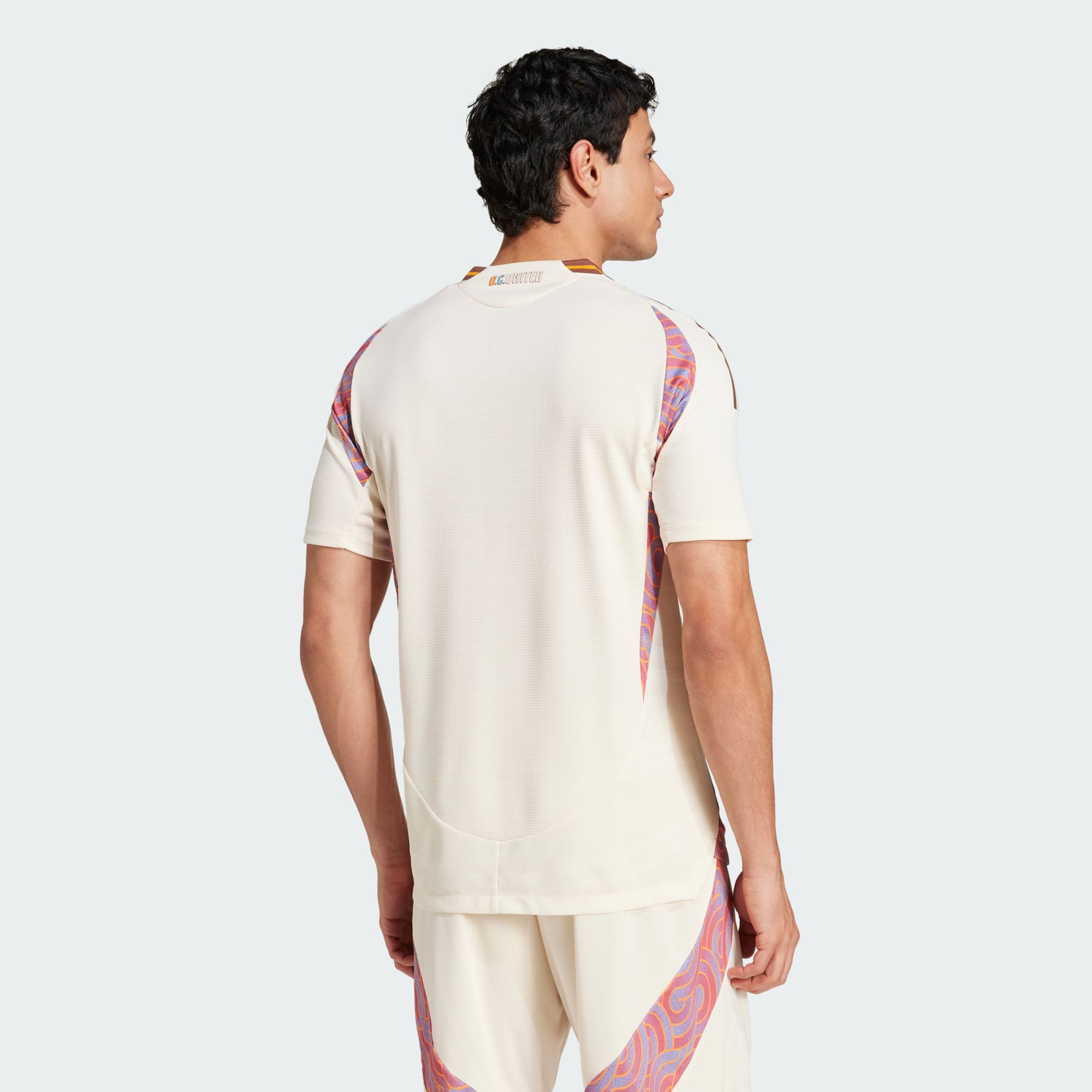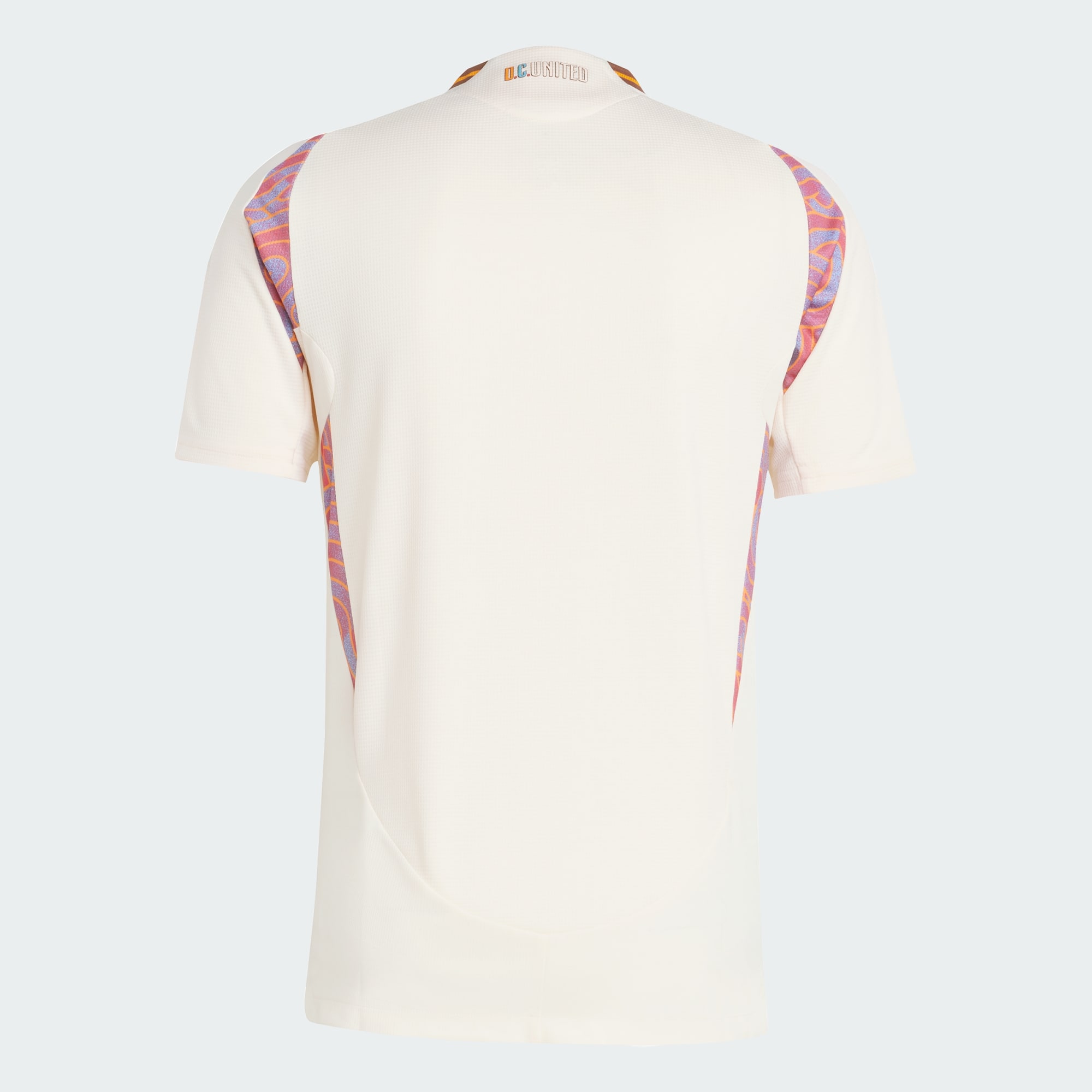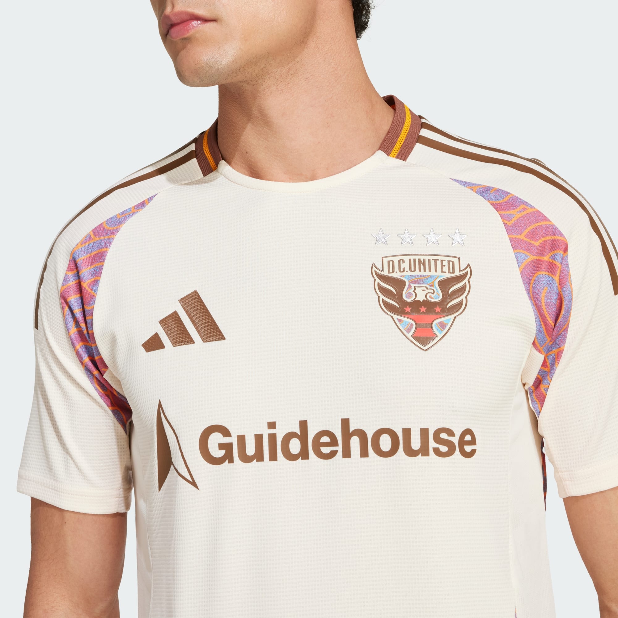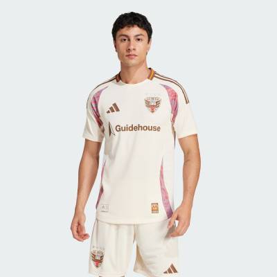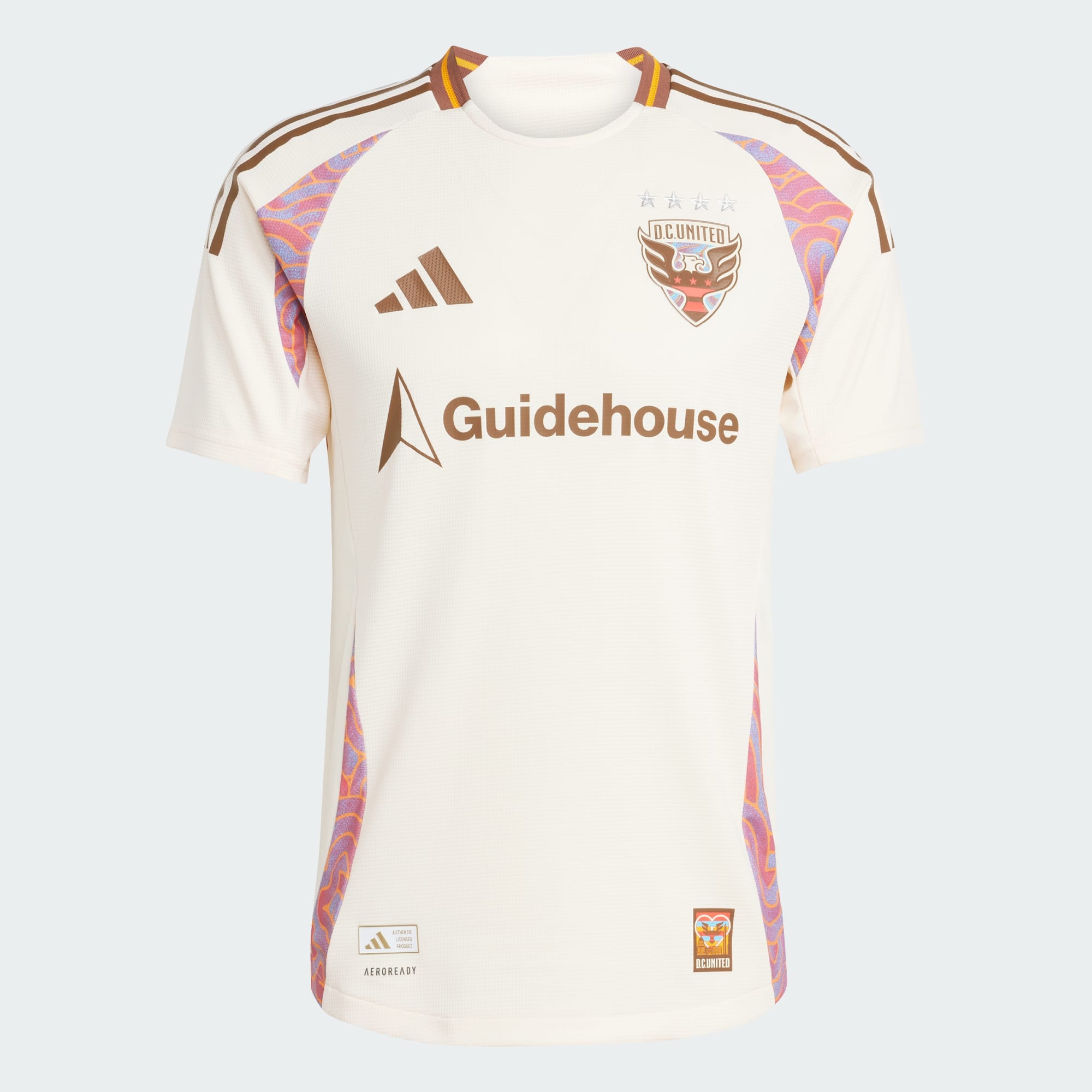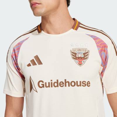 The adidas design reflects the city's cultural and musical influence, paying tribute to the beats and rhythms that have shaped its identity. The kit features an Ecru Tint (off-white) base with intricate wave-like patterns in vibrant hues inspired by Go-Go’s signature percussion and the city’s energy. The brown Three Stripes and club crest create a vintage aesthetic, while the collar trim adds a nod to the movement’s colourful vibrance.