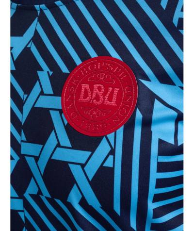 Combining the stylings worn outfield and, by national hero Peter Schmeichel, in goal 31 years ago, as part of a collection celebrating the 30th anniversary of that iconic win, the navy-and-sky-blue warmup top is further embellished with a tonal red DBU crest.