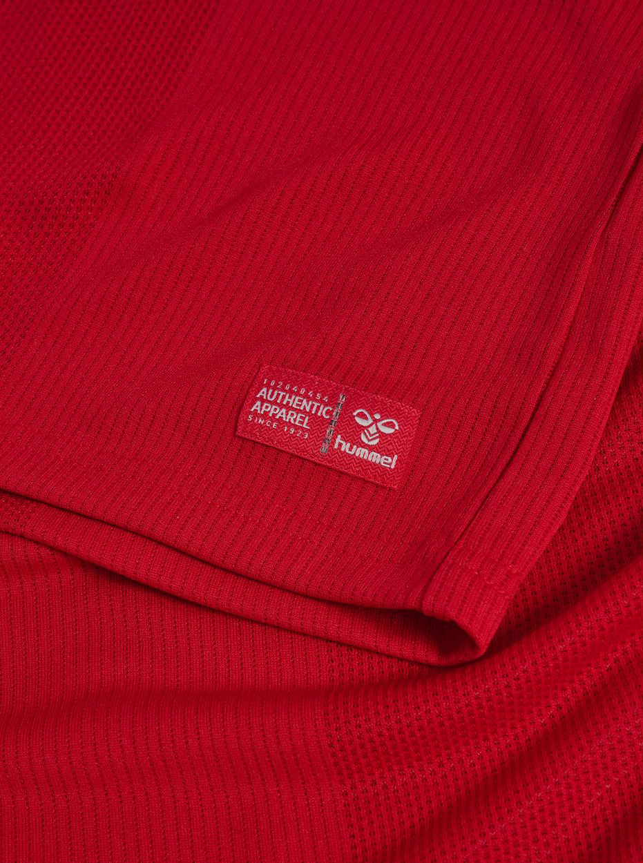 Inside the collar, the Danish flag is integrated into the neckline with the inscription “For Danmark”. This internal detail references the national identity associated with the team and the supporters who follow the side internationally. Constructed using hummel performance fabric, the jersey features breathable mesh zones across the body. A small woven Authentic Apparel label is positioned near the lower hem.