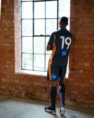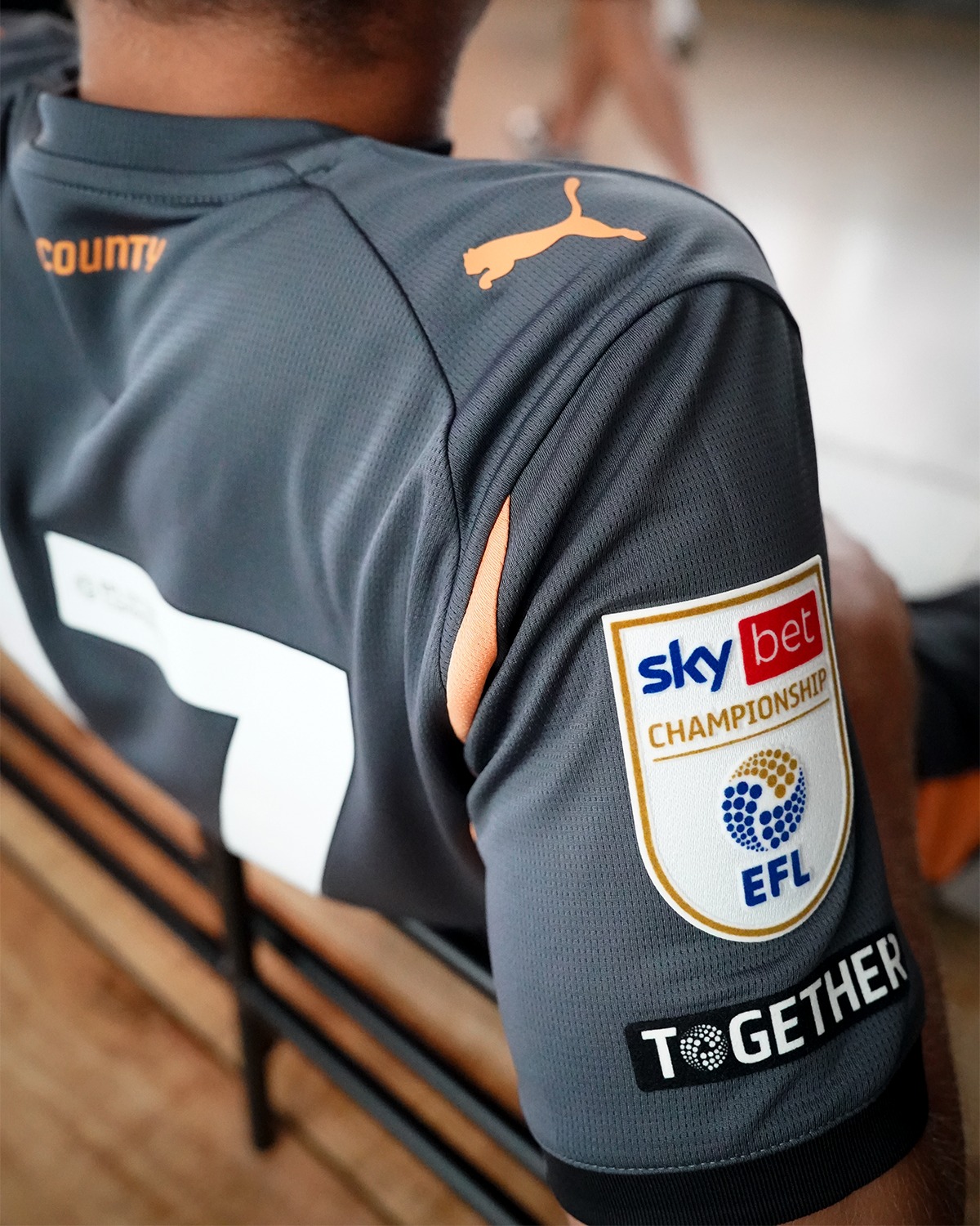 The shirt features a dark grey base with vivid orange side panels, and has a black V-neck collar with matching black sleeve cuffs. The Puma logo and the club’s embroidered ram crest are both presented in orange on the chest, while the sleeve includes the Sky Bet Championship patch and Together branding.