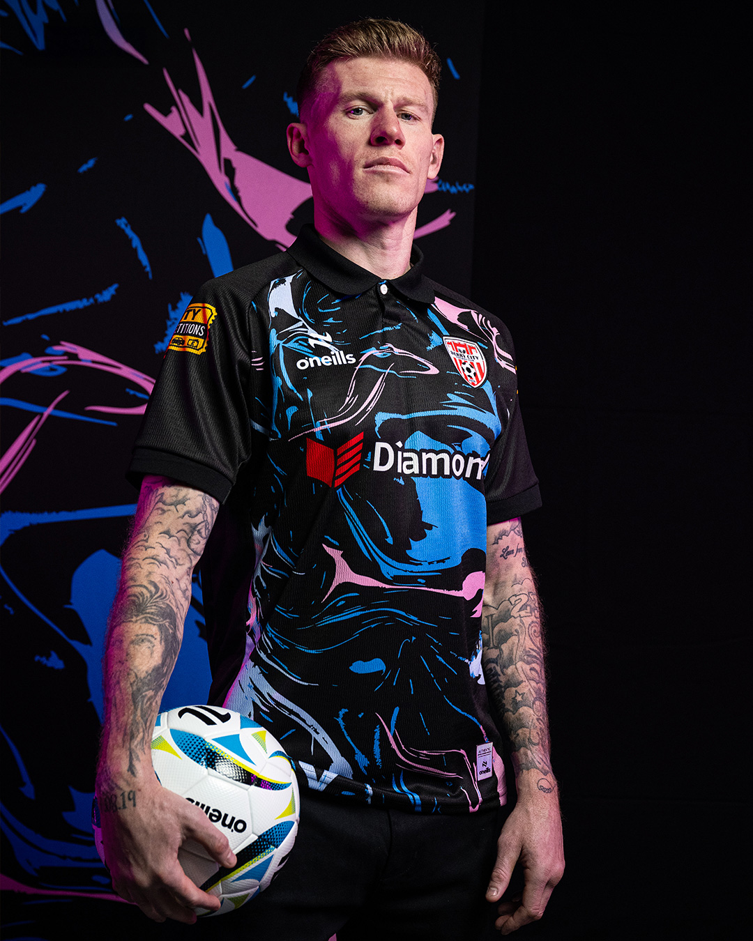 The Derry City crest is positioned on the left chest in full colour, with the O’Neills logo opposite. Diamond appears centrally as the main shirt sponsor. Sleeve partners are printed in yellow, and additional sponsor branding is applied to the reverse. An O’Neills authenticity tag is located near the lower hem.