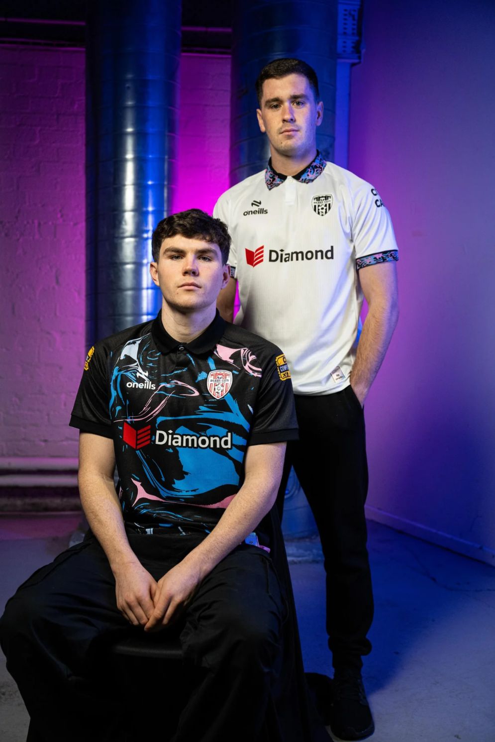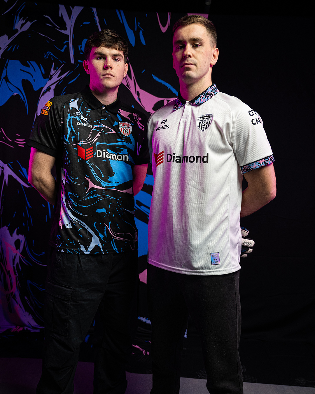 The accompanying Derry City 2026 goalkeeper shirt is presented in white with a textured fabric finish. It features a polo collar and sleeve cuffs detailed with a multicoloured trim incorporating blue and pink tones on a black base. Both shirts are constructed using O’Neills performance materials and will be paired with coordinated shorts and socks for official match use during the 2026 League of Ireland campaign.