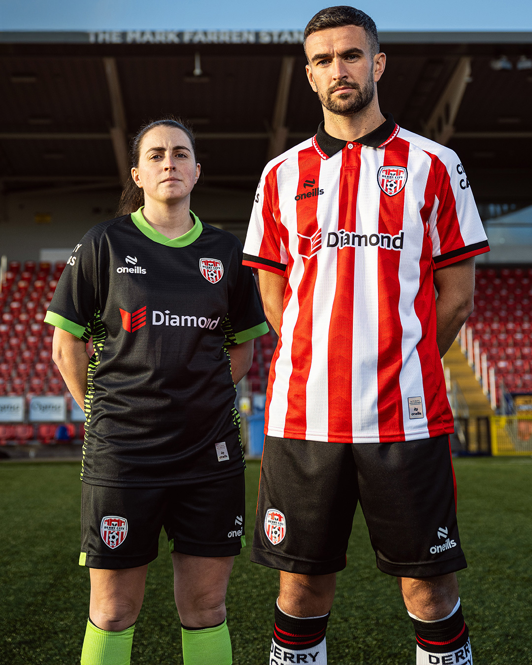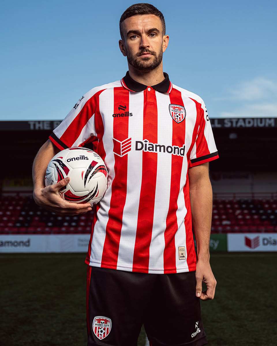 Derry City have revealed their new O’Neills Home kit and accompanying Goalkeeper kit for the 2026 season. The Derry City football shirt follows the club’s recognised red and white stripe identity, presented through alternating panels that incorporate a subtle chevron texture woven into the fabric.