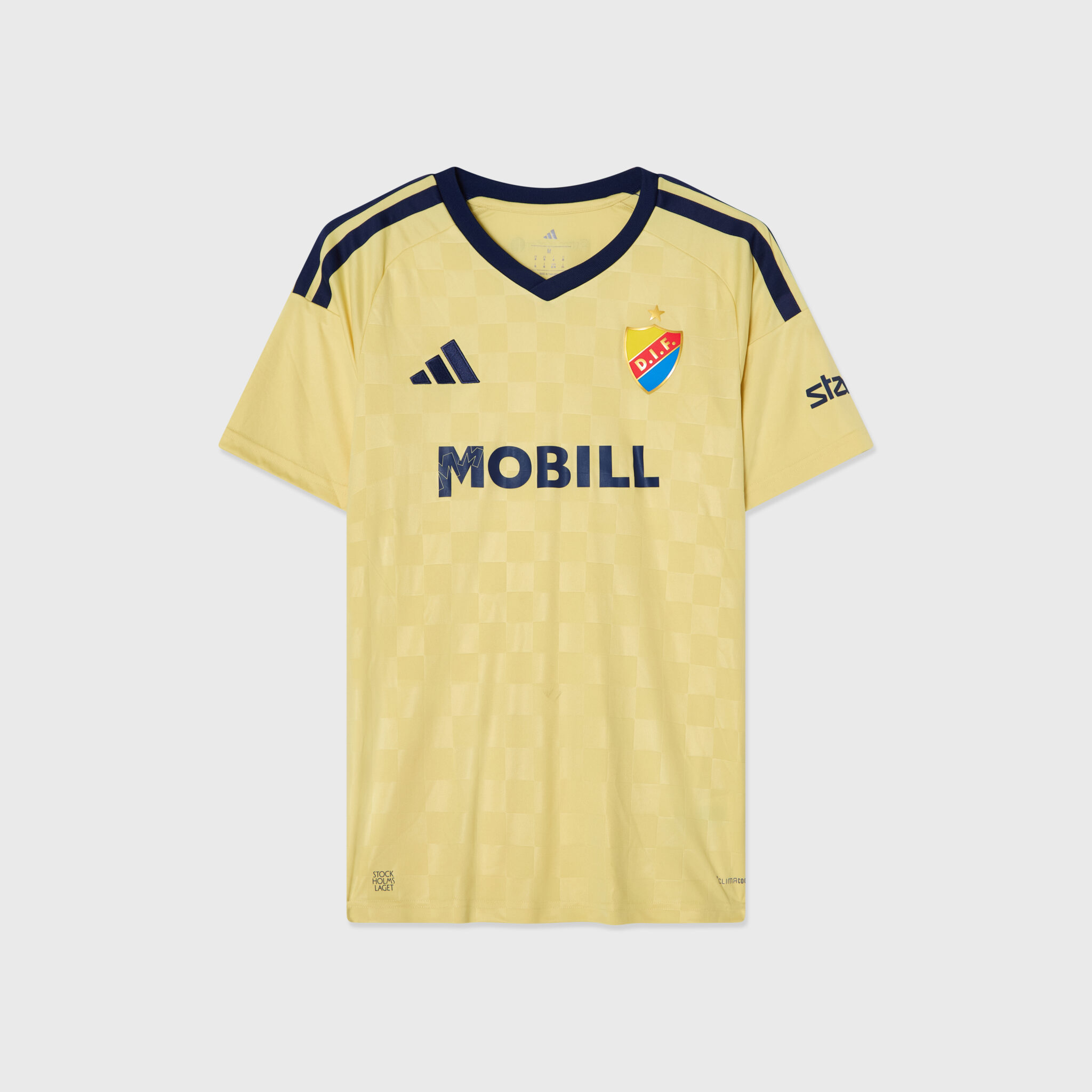 The new Djurgårdens jersey is presented in a soft pale yellow base with navy detailing across the upper section. A subtle tonal check pattern is integrated into the fabric, creating a textured surface across the front panel. The back remains predominantly yellow with a clean, uninterrupted finish.