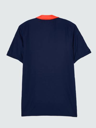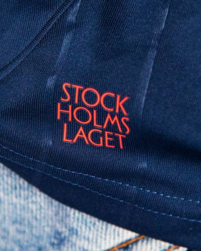 The back of the shirt remains solid navy without any extra graphics or patterns. A small detail reading “Stockholmslaget”, which translates to “The Stockholm Team”, is printed in red near the hem of the shirt, which is paired with matching navy shorts and socks.