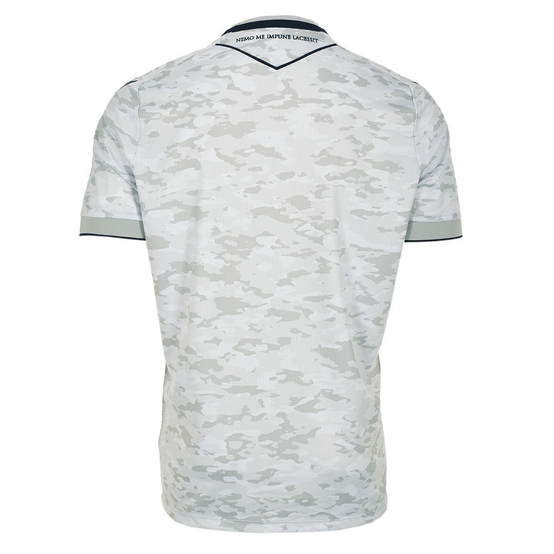 The Macron third jersey features a light grey base with a subtle camouflage pattern, reflecting a connection to the armed forces. The club crest and sponsor logos are presented in navy blue, complementing the grey collar and sleeve cuffs. The Macron logo appears on the chest and sleeves.