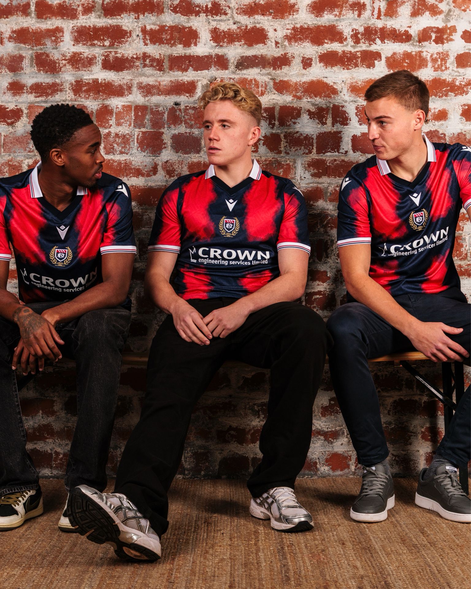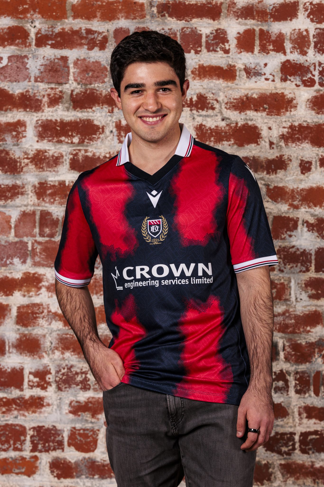 A collar is finished in white with navy and red trim, matching the detailing on the sleeve cuffs. The main sponsor, Crown Engineering Services Limited, is printed across the front in white. Inside the collar, Macron’s branding and performance system markings are included on a printed label. The back of the shirt shows the year 1893 placed below the collar.
