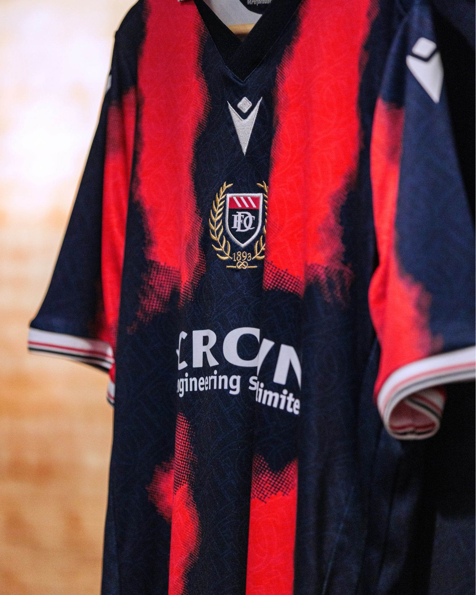 The Dundee FC football shirt by Macron features a navy base combined with striking red areas across the front and sleeves. A tonal pattern is embedded within the fabric, creating a repeated club graphic that runs across both the front and back panels. Macron’s logo appears on each sleeve and on the right side of the chest, opposite the Dundee FC crest, which sits within a wreath and carries the 1893 founding year.