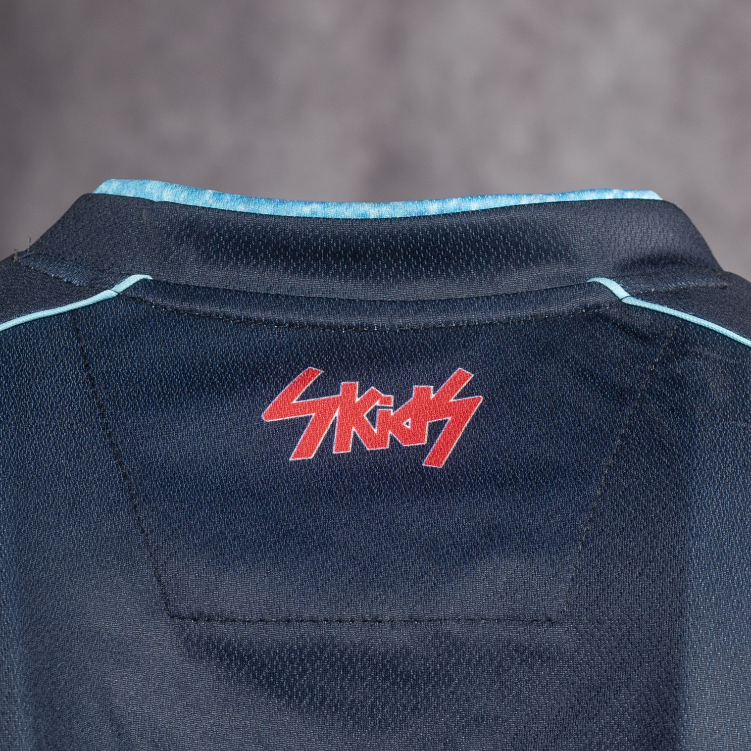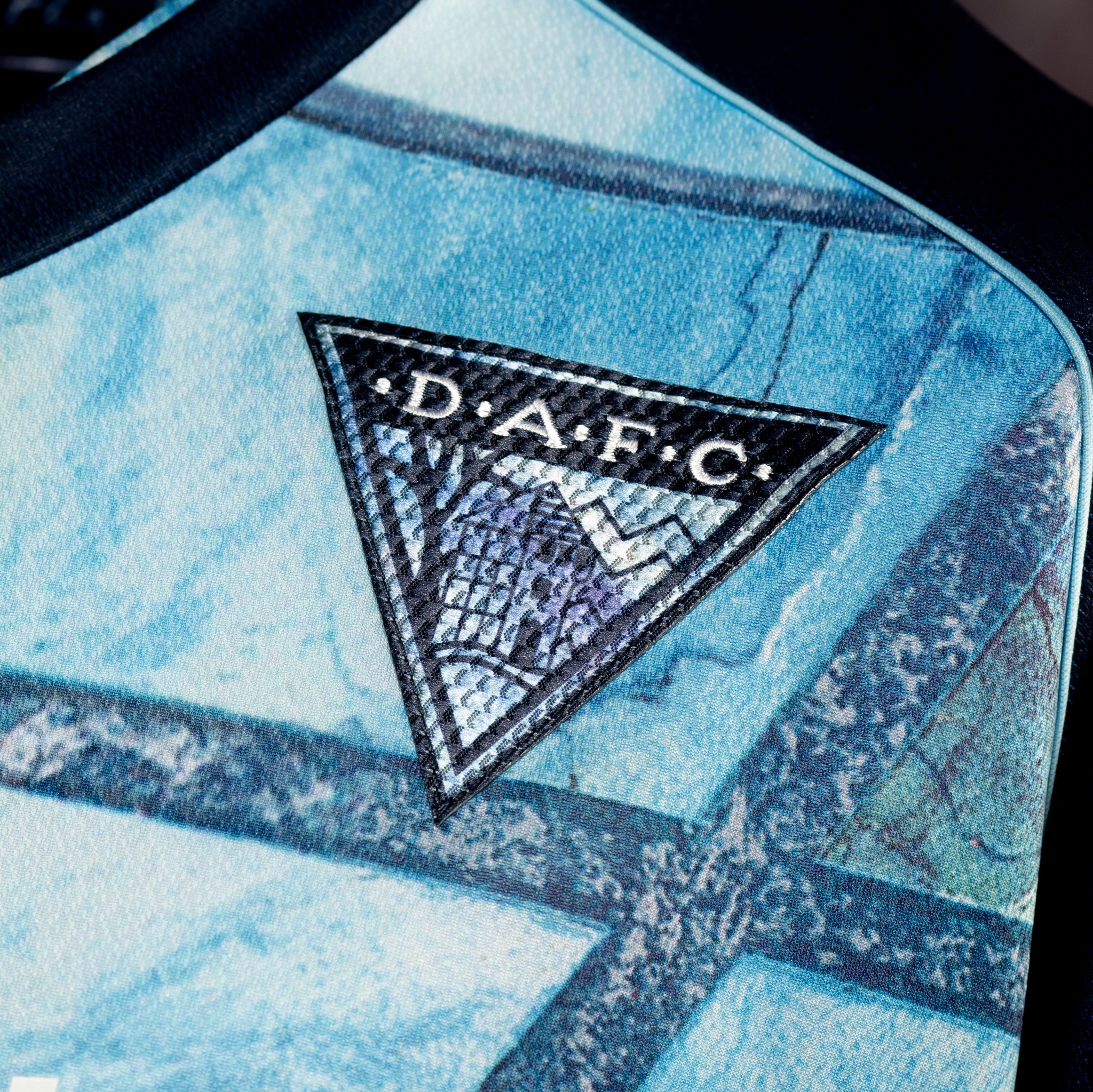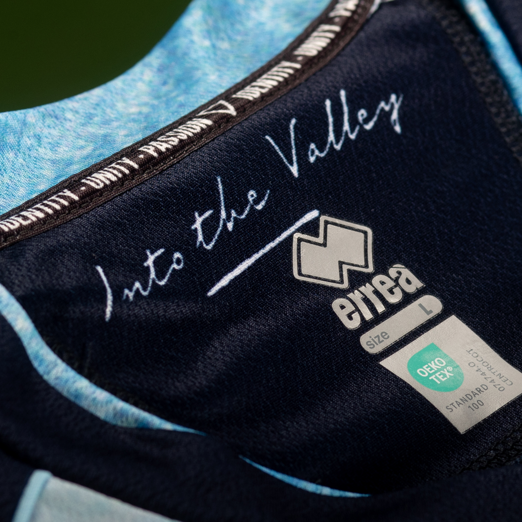 The jersey comes in a marble blue graphic with dark blue sleeves and trim. The Pars crest has been colour-matched to blend with the design, while the Erreà logo is embroidered in dark blue. Inside the collar is the handwritten title “Into the Valley,” referencing the song that still plays before every Dunfermline match, while the trim is detailed with the words “Identity, Unity, Passion.” On the back of the neck, the Skids’ red logo is printed.