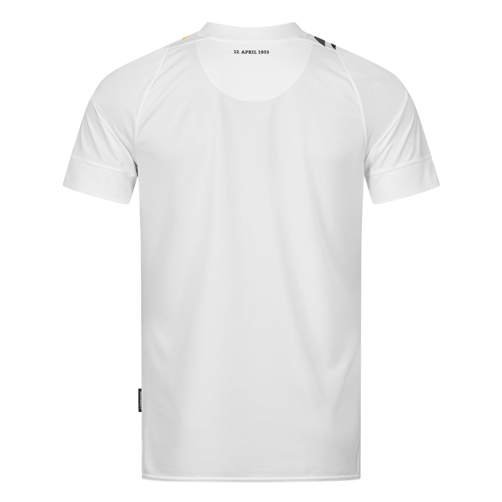 Newly of Germany’s 3. Liga, Dynamo’s 2022-23 primary change design is in white with a complex graphical element in black, grey and yellow.