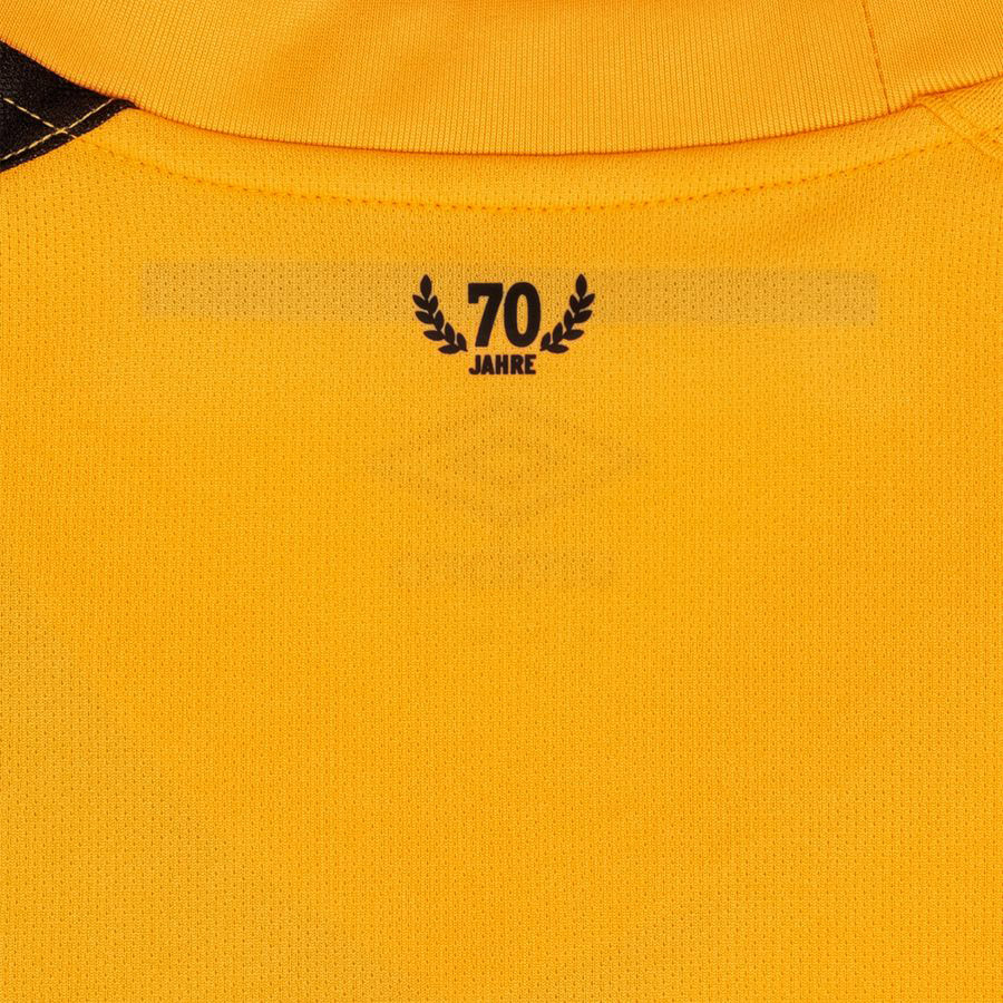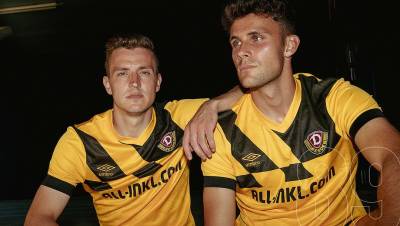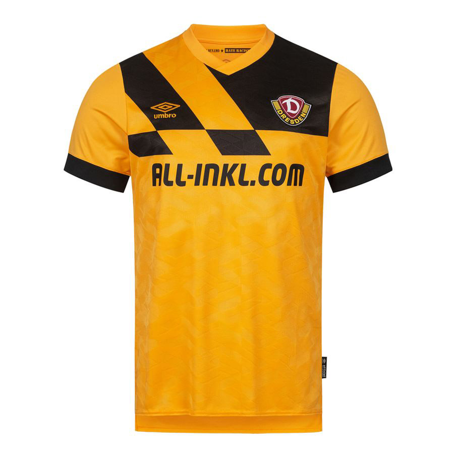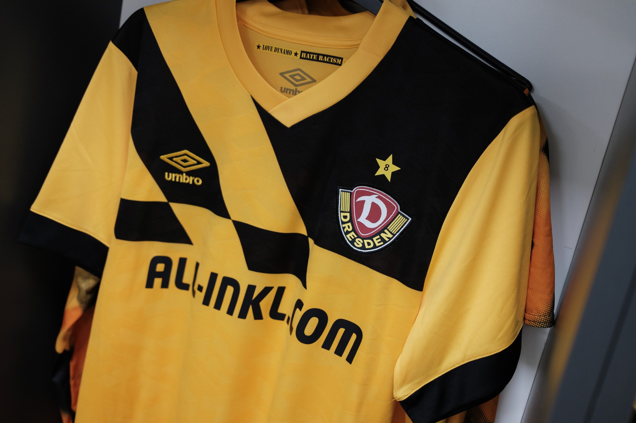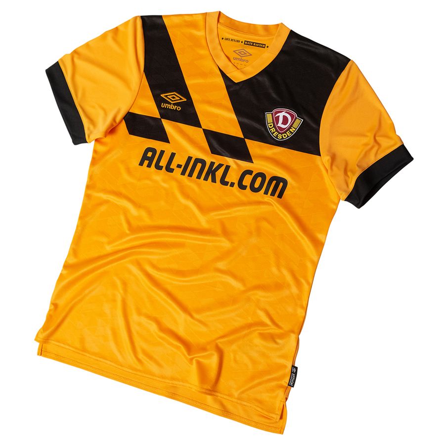 Produced by Umbro, the new primary design is a nod to the equivalent worn in the 1988-89 DDR-Oberliga, when Dynamo once again became champions of East Germany, pre-reunification, and the yellow and black are combined in blocks with slanted edges, with the base also featuring a patterned jacquard.