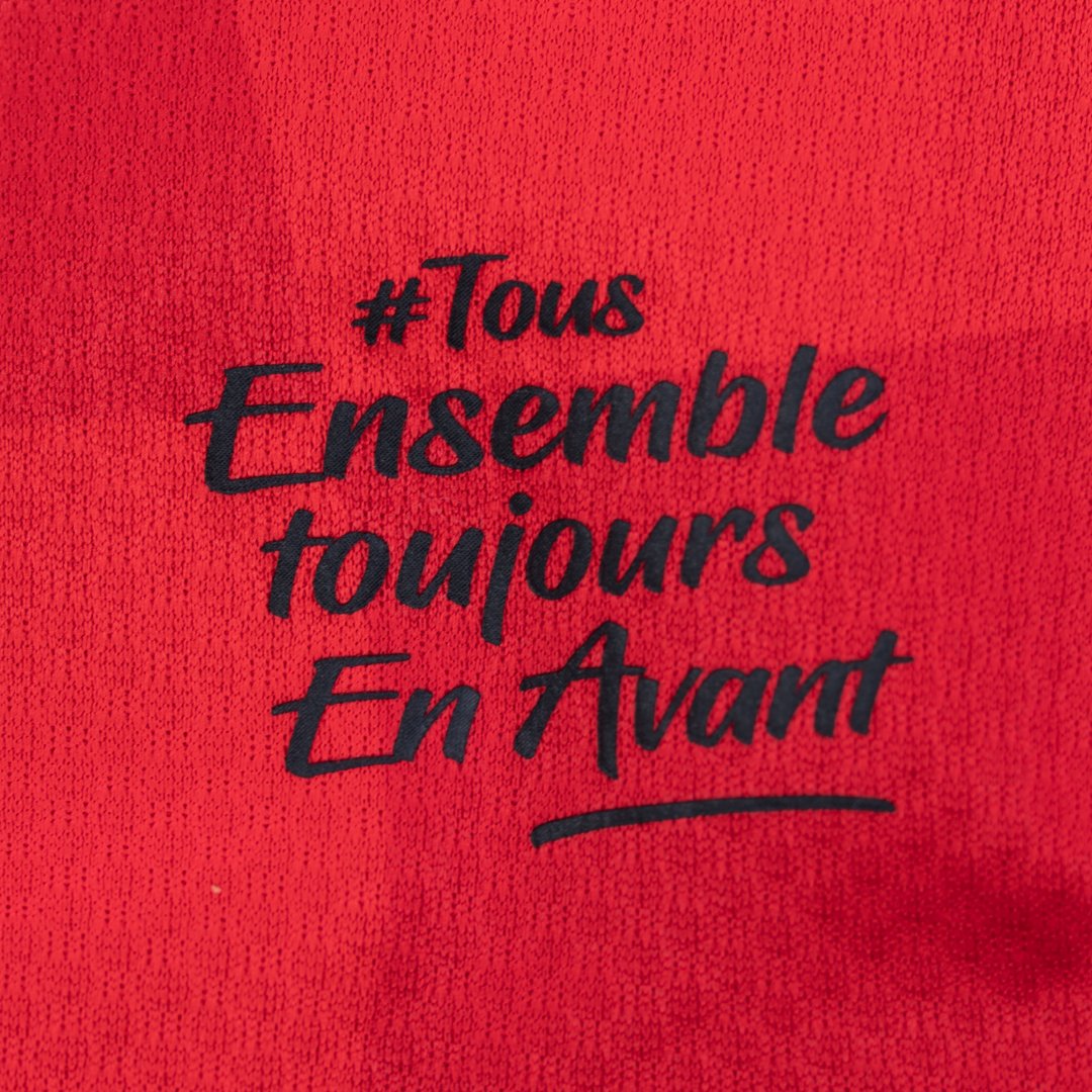 Just above this feature is the script “Tous Ensemble toujours En Avant” and the kit will be completed with black shorts and red socks.