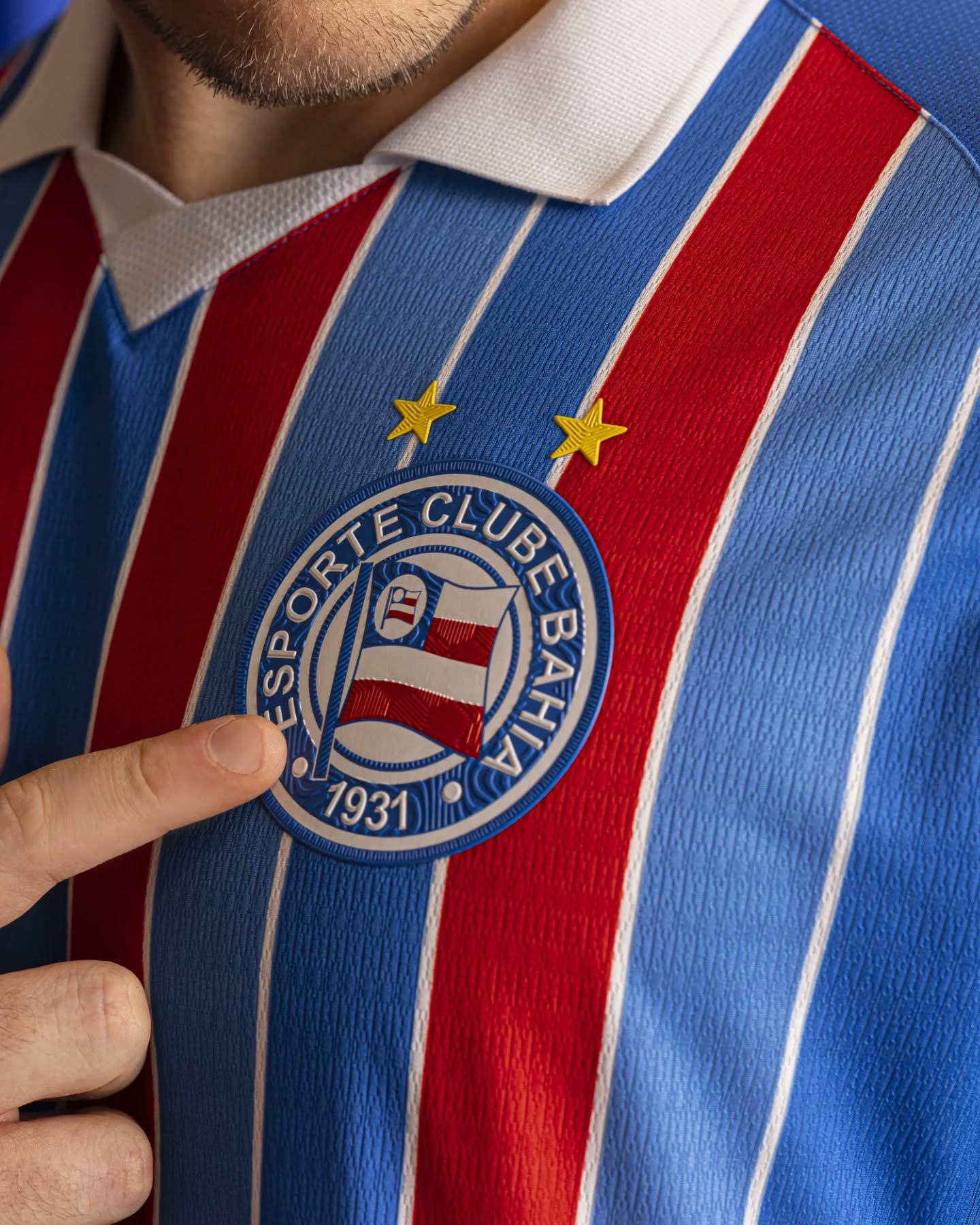 The new EC Bahia jersey features the club’s traditional vertical striping, with red and blue bands presented in equal width, separated by narrower white pinstripes.