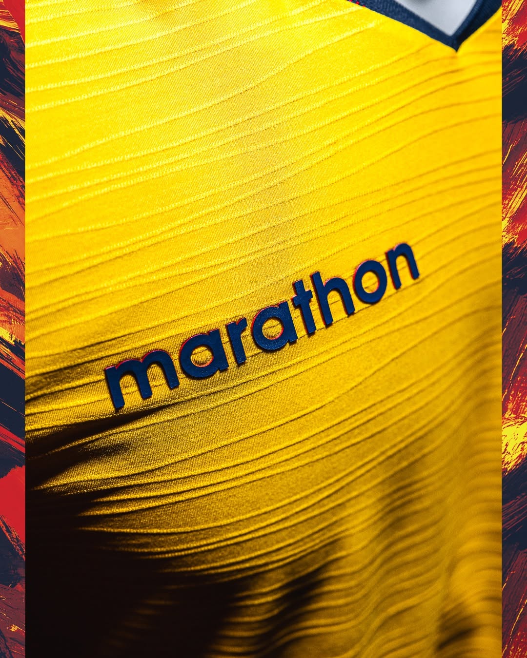 The new Ecuador jersey features a bold yellow base, with a navy V-neck collar incorporating a red inner stripe detail and matching navy trim with subtle red accents applied to the sleeve cuffs. The FEF crest sits on the left chest, while the Marathon logo is positioned on the right. A navy and red patterned insert runs down the sides, adding a distinctive detail to the overall construction.