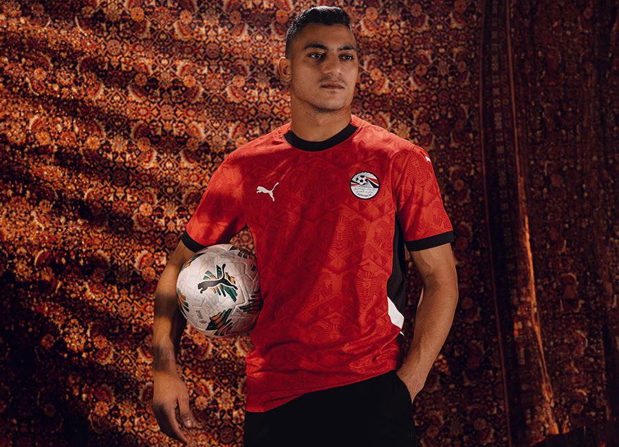 The 2024-2026 Puma primary design for the representative side of the Egyptian Football Association (EFA) is in red with tonal patterning referring to Egypt’s ancient/historical culture - depicting pharaohs, as a nod to the team nickname - and it has black and white panelling/trim, black cuffs and a black portion to the crew neck.